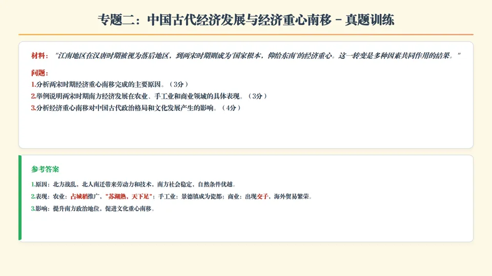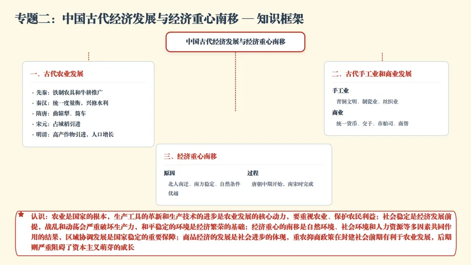 ★认识观点总结 •农业是国家根本,生产工具革新和技术进步是农业发展核心动力,要重视农业、保护农民利益 •社会稳定是经济发展前提,战乱和动荡破坏生产力,和平稳定是经济繁荣基础 •经济政策要符合发展规律,合理政策激发经济活力,反之阻碍发展 •经济重心南移是多因素共同作用结果,区域协调发展是国家稳定重要保障 •商品经济发展是社会进步体现,重农抑商政策后期阻碍资本主义萌芽成长 |