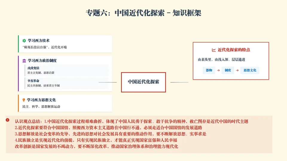 ★认识观点总结 •中国近代化探索艰难曲折,体现中国人民勇于探索、敢于抗争精神,救亡图存是近代中国时代主题 •近代化探索要符合中国国情,照搬西方资本主义道路行不通,必须走适合国情的发展道路 •思想解放是社会变革先导,先进思想推动社会发展,要不断解放思想、实事求是 •民族独立是实现近代化前提,只有实现民族独立,才能真正实现国家富强和人民幸福 •改革创新是国家发展不竭动力,要不断深化改革,推动国家治理体系和治理能力现代化 |