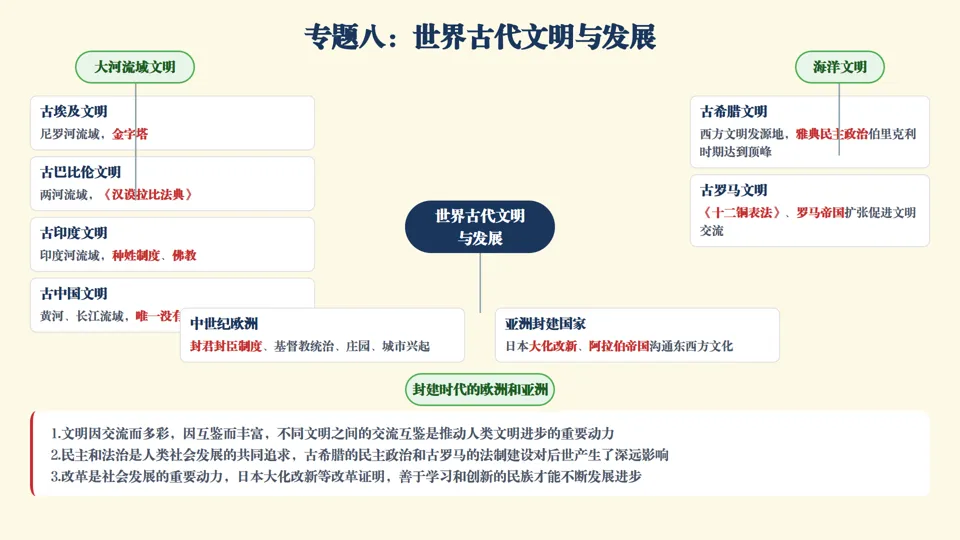 ★认识观点总结 •世界文明具有多样性,不同地区文明各有特色,都是人类共同宝贵财富,要尊重文明多样性 •自然地理环境对文明发展有重要影响,大河流域孕育农耕文明,海洋文明工商业发达,不同文明没有优劣之分 •文明因交流而多彩、因互鉴而丰富,不同文明交流互鉴是推动人类进步重要动力 •民主和法治是人类社会共同追求,古希腊民主政治和古罗马法制建设对后世影响深远 •改革是社会发展重要动力,日本大化改新等证明,善于学习创新的民族才能不断进步 |