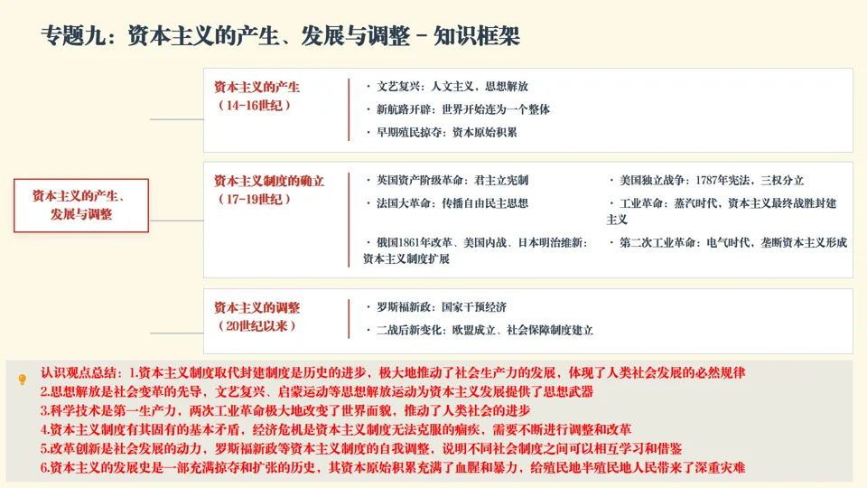 ★认识观点总结 •资本主义制度取代封建制度是历史进步,极大推动生产力发展,体现人类社会发展必然规律 •思想解放是社会变革先导,文艺复兴、启蒙运动等为资本主义发展提供思想武器 •科学技术是第一生产力,两次工业革命极大改变世界面貌,推动人类社会进步 •资本主义制度有固有基本矛盾,经济危机是无法克服的痼疾,需要不断调整改革 •改革创新是社会发展动力,罗斯福新政等自我调整说明不同社会制度可以相互学习借鉴 •资本主义发展史是充满掠夺扩张的历史,资本原始积累充满血腥暴力,给殖民地半殖民地人民带来深重灾难 |