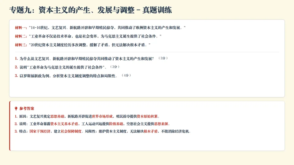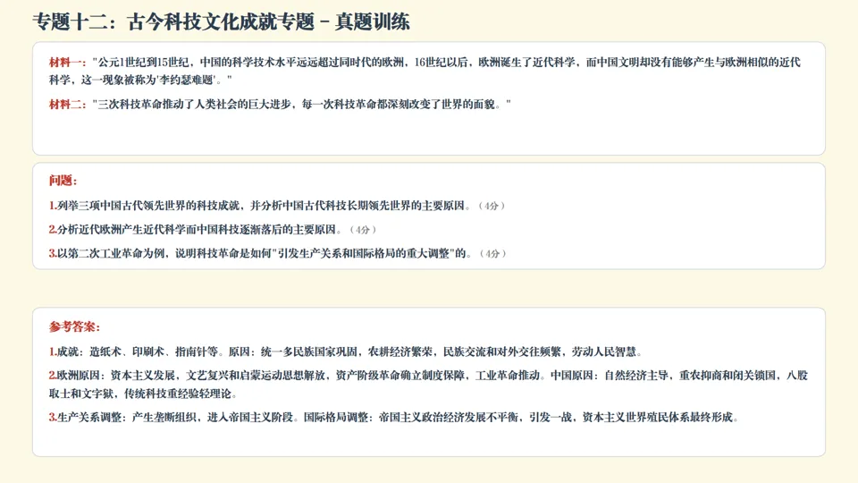 真题演练 (材料分析题,12分)阅读材料,完成下列要求。材料一:"英国学者李约瑟在《中国科学技术史》中指出,公元1世纪到15世纪,中国的科学技术水平远远超过同时代的欧洲,16世纪以后,欧洲诞生了近代科学,而中国文明却没有能够产生与欧洲相似的近代科学,这一现象被称为‘李约瑟难题’。"材料二:"三次科技革命推动了人类社会的巨大进步,每一次科技革命都深刻改变了世界的面貌。从蒸汽时代到电气时代再到信息时代,科技革命不仅带来了生产力的飞跃,也引发了生产关系和国际格局的重大调整。"问题:1. 列举三项中国古代领先世界的科技成就,并分析中国古代科技长期领先世界的主要原因。(4分)2. 结合16-19世纪的相关史实,分析近代欧洲产生近代科学而中国科技逐渐落后的主要原因。(4分)3. 以第二次工业革命为例,说明科技革命是如何"引发生产关系和国际格局的重大调整"的。(4分) 参考答案:1. 成就:造纸术、印刷术、指南针、火药、《本草纲目》等任意三项即可(1分)。原因:统一多民族国家巩固发展提供稳定社会环境;农耕经济繁荣为科技发展提供物质基础;各民族交流和对外交往促进科技文化传播;古代劳动人民智慧和创新精神。(答出任意3点即可得3分)2. 欧洲原因:资本主义经济发展为近代科学产生提供物质基础;文艺复兴、启蒙运动冲破封建神学束缚,促进思想解放;资产阶级革命确立资本主义制度,为科技发展提供制度保障;工业革命推动科学技术进步。(2分)中国原因:自给自足自然经济占主导,限制生产力发展,缺乏科技发展内在需求;统治者推行重农抑商和闭关锁国政策,阻碍中外科技交流;明清八股取士、文字狱压制知识分子创新精神;传统科技重经验总结、轻理论探究,不利于近代科学体系形成。(2分)3. 生产关系调整:第二次工业革命促进生产力巨大发展,生产和资本高度集中,产生垄断组织,主要资本主义国家由自由资本主义进入垄断资本主义即帝国主义阶段。(2分)国际格局调整:第二次工业革命导致帝国主义国家政治经济发展不平衡,后起国家要求重新瓜分世界,引发第一次世界大战;同时列强加紧对外扩张,资本主义世界殖民体系最终形成,东方完全从属于西方。(2分) |