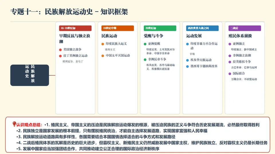 ★认识观点总结 •殖民主义、帝国主义压迫是民族解放运动爆发根源,被压迫民族正义斗争符合历史潮流,必然取得胜利 •民族独立是国家发展根本前提,只有摆脱殖民统治,才能自主选择发展道路,实现国家富强和人民幸福 •民族解放运动道路具有多样性,各国需结合国情选择适合的斗争方式和发展路径 •二战后殖民体系瓦解是历史巨大进步,但霸权主义、新殖民主义仍威胁发展中国家主权,维护民族独立、反对霸权主义是长期任务 •发展中国家应加强团结合作,共同推动建立公正合理的国际政治经济新秩序 |