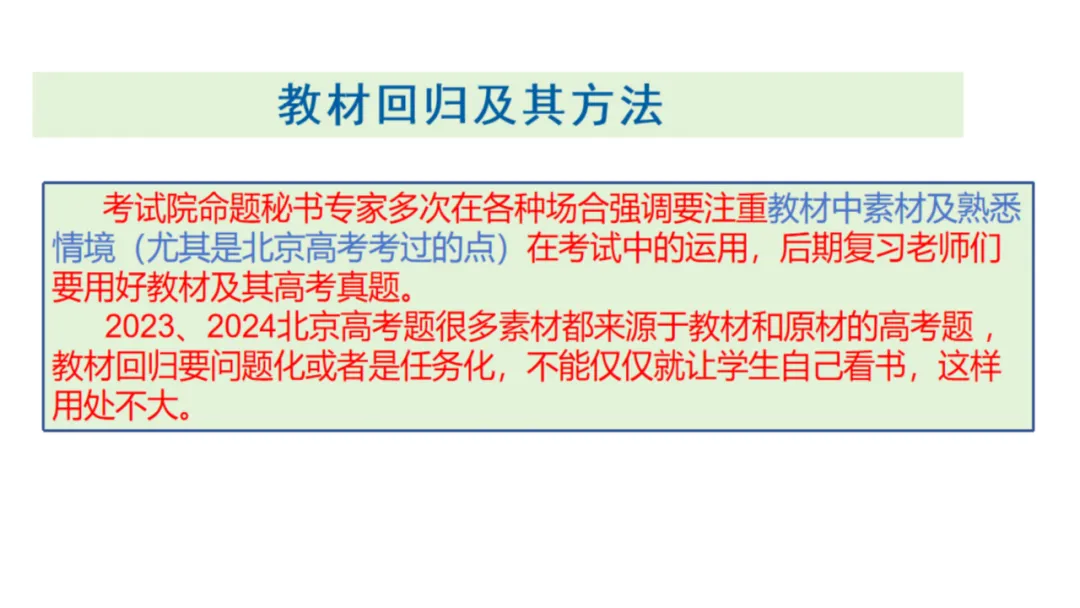 高三后期,老师们要用好高考题和教材,对于高三的教师和学生来说:近几年的高考题要像教材、课标一样重视(高考题就是最好的复习资料)。