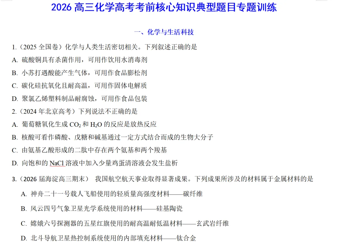 >26高三化学二轮三轮复习资料大全:包含二、三轮专题、真题讲解、教材回归、考前文字表述、精准答题、课标规定必做实验(山哥设计)