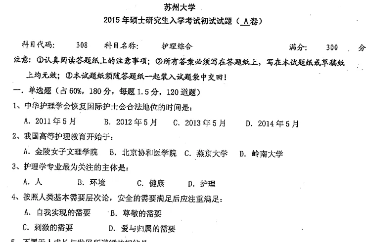2004-2024、2026年苏州大学308护理综合考研真题试卷【16年开始学校不公布,回忆版】