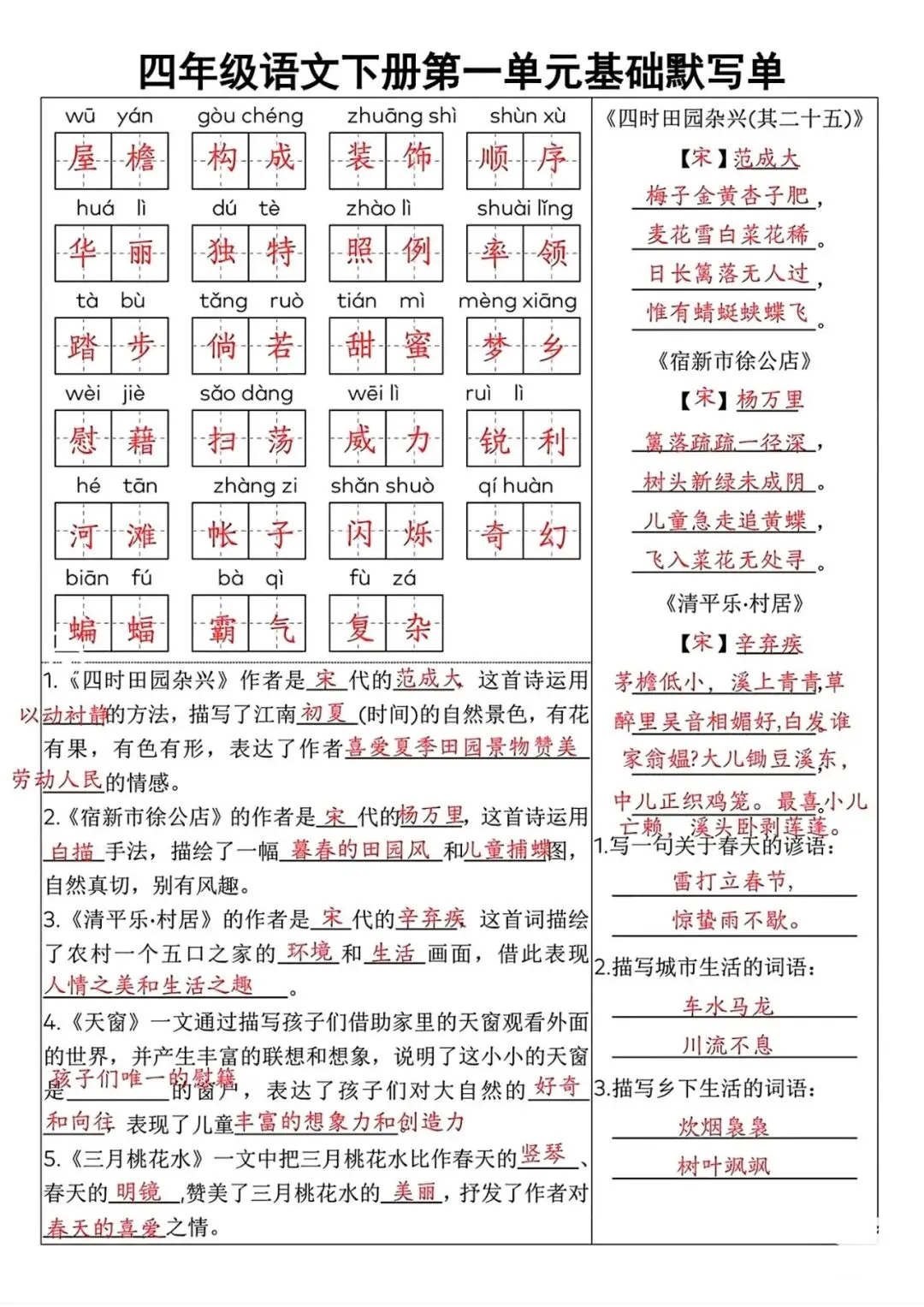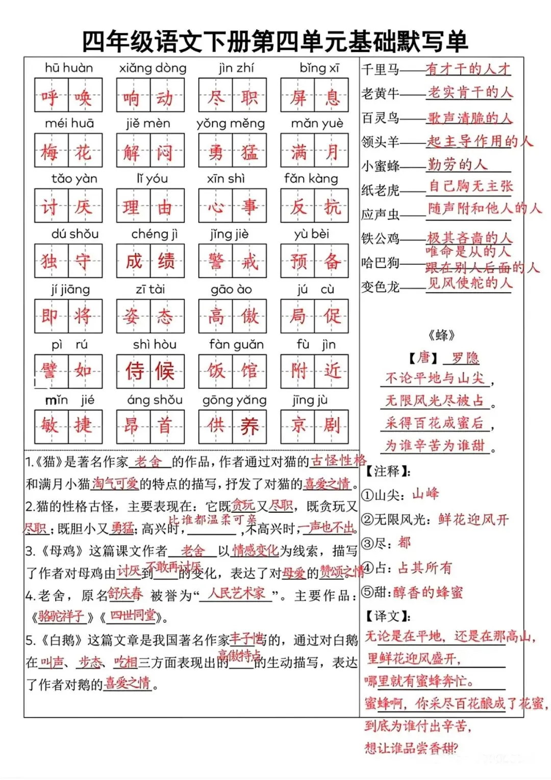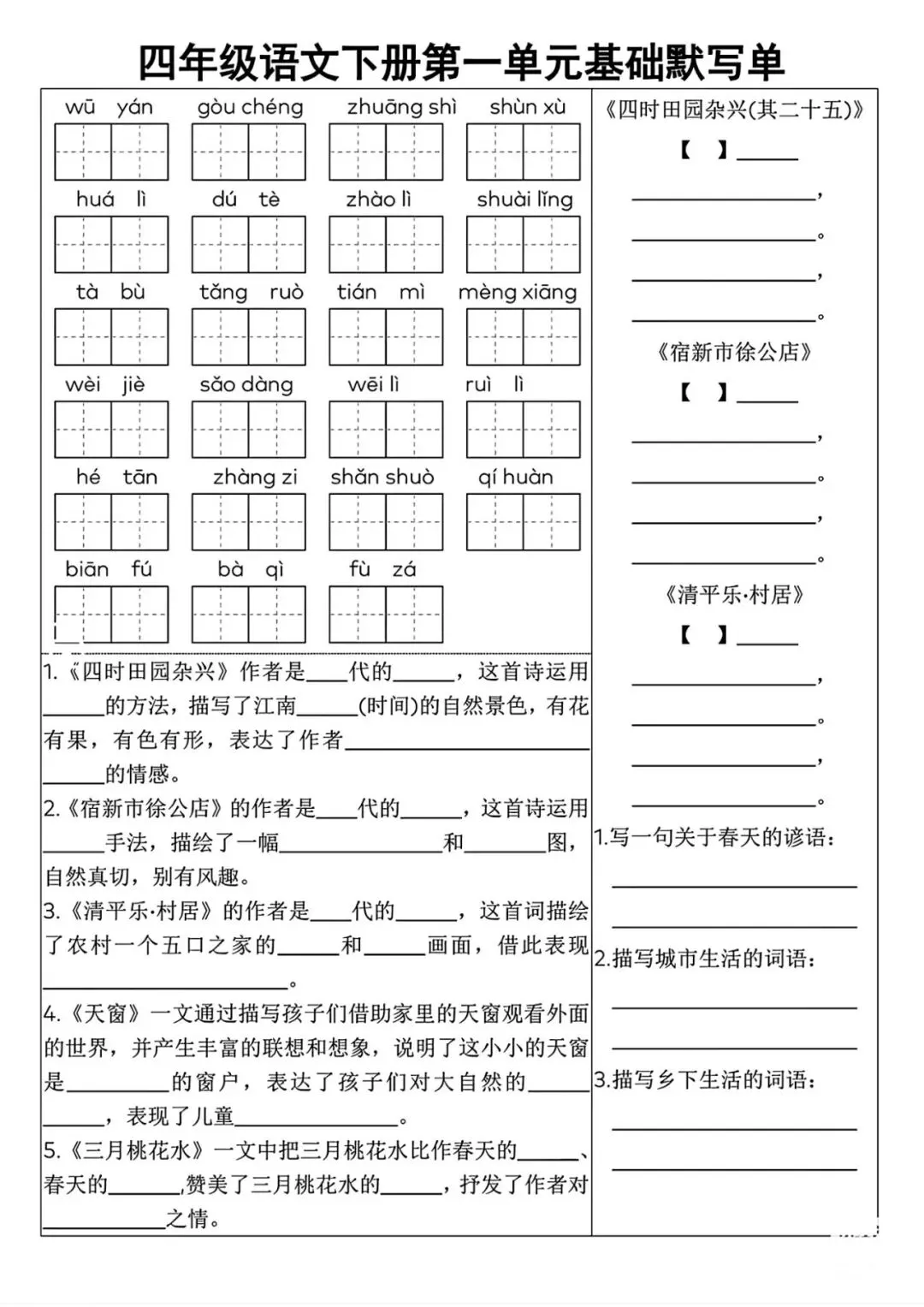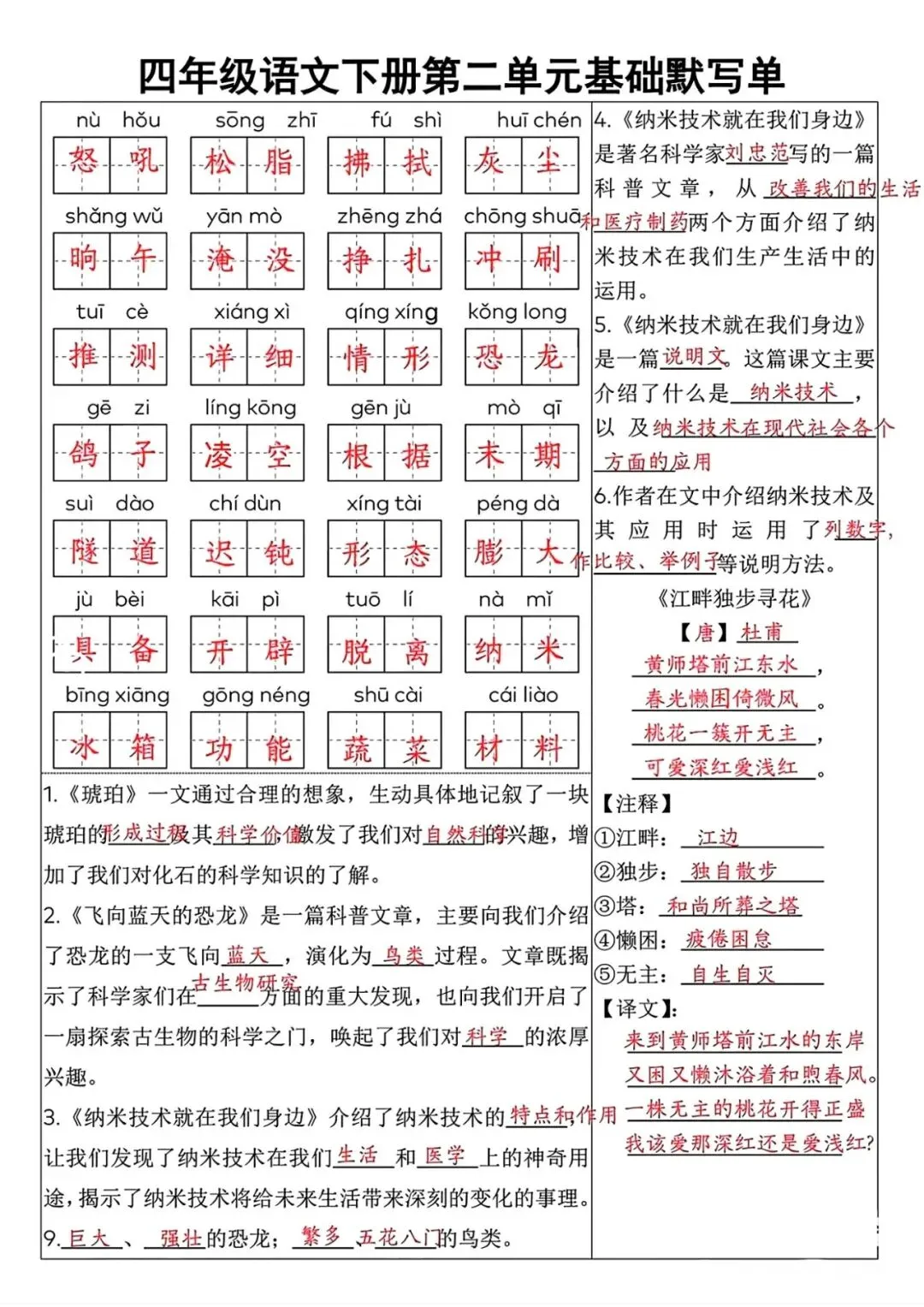 四年级语文下册全册单元复习资料(默写+知识点+拓展),打印给孩子巩固学习!