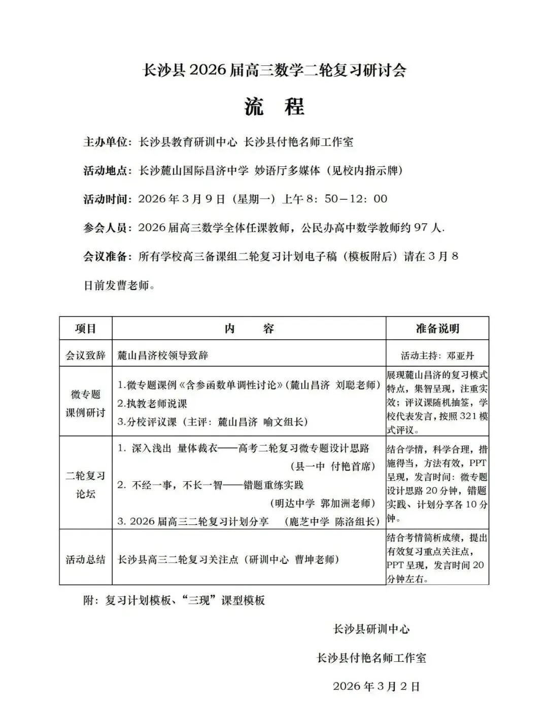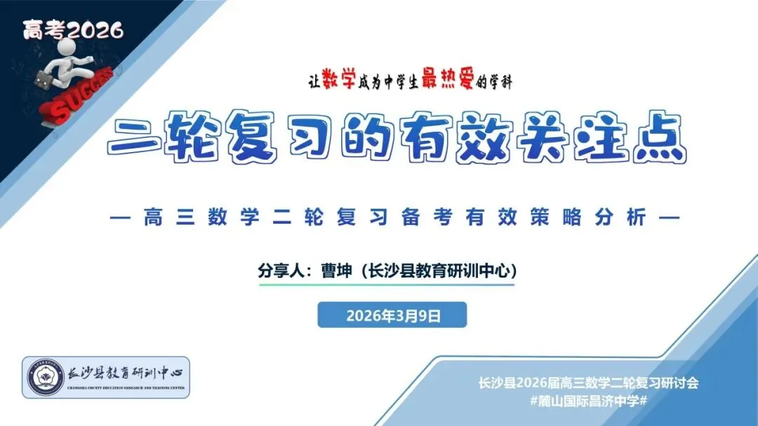 2026年3月9日上午,长沙县2026届高三数学二轮复习研讨会在麓山国际昌济中学举行,研训中心曹坤老师分享了微讲座《二轮复习的有效关注点》,给全县高三任课教师带来思考。