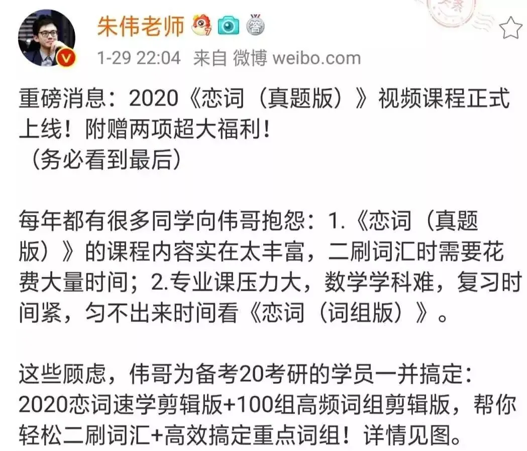 朱伟老师的《恋练有词》就根据往年同学的建议,做出来2020恋词速学剪辑版+100组高频词组剪辑版,在二刷的时候能够有侧重点,更高效地复习。
