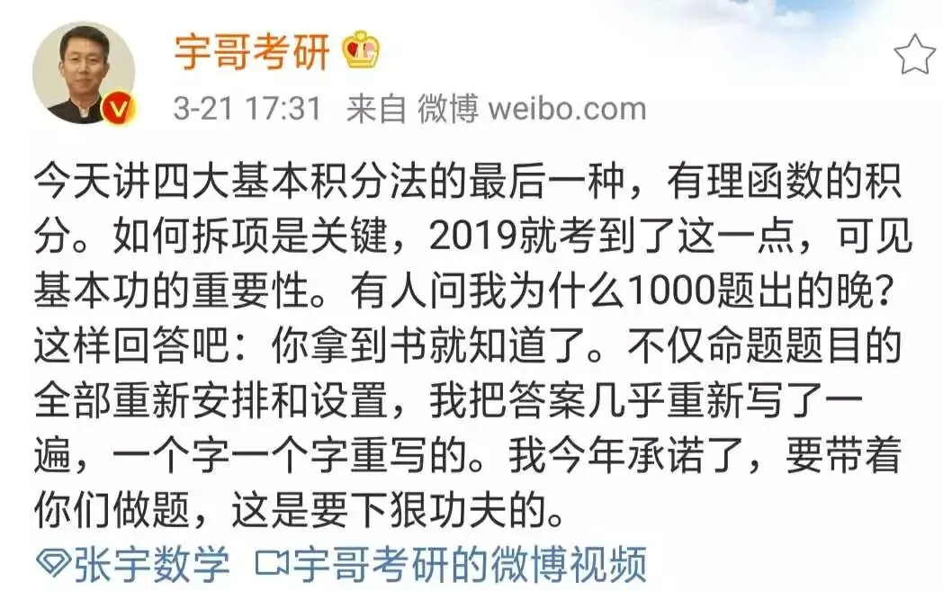 数学的变化也不会太大,但比如像宇哥的1000题,今年他对的命题题目做了重新安排和设置,而且还重新写了一遍答案。强哥觉得,复习的时候可以跟着大佬的节奏,这样才能知道自己要复习到哪了,不会堆积。