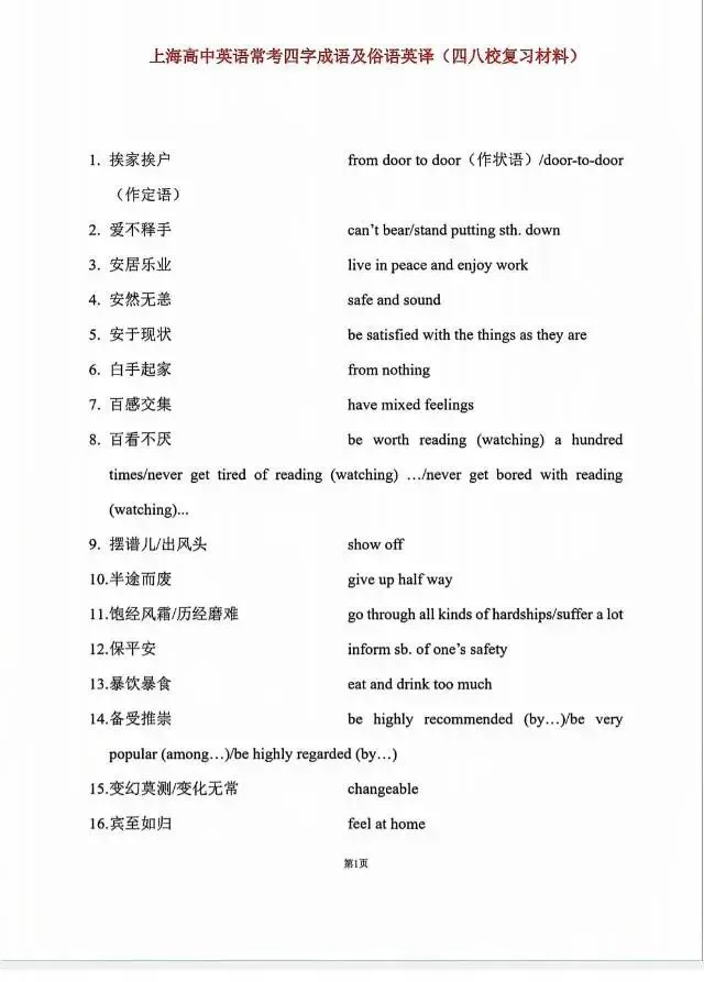 上海高考英语最后冲刺之复习资料汇总 —— 名校高频四字格和成语