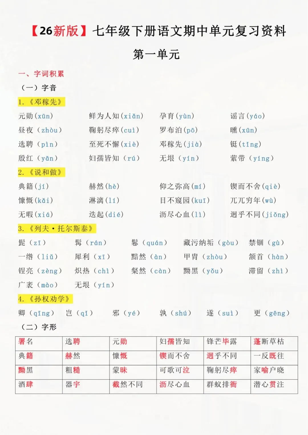 老师为大家整理了:七年级下册语文 期中单元复习资料 电子版可打印!