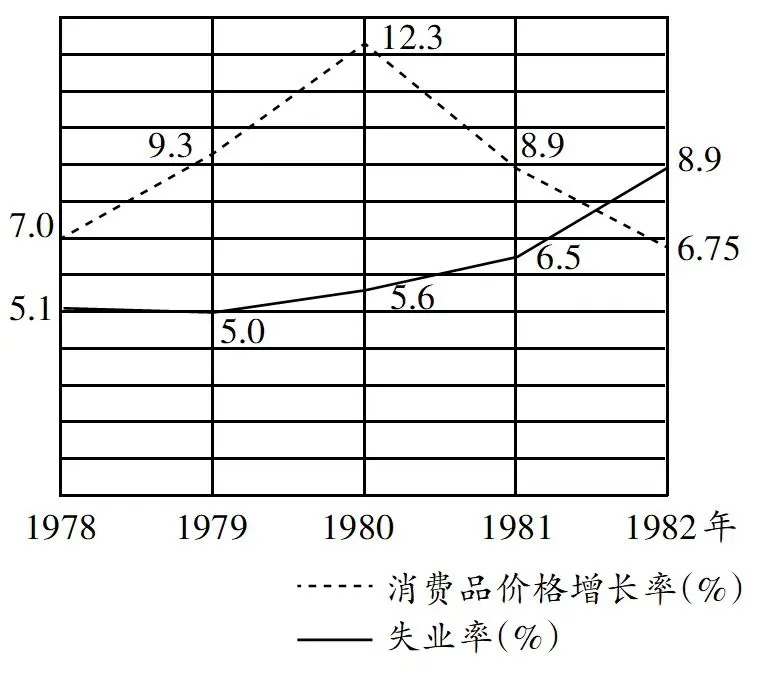 【解析】据图表信息,1978—1982年消费品价格增长率经历了先上升后下降的过程,整体上维持在较高增长水平,失业率则逐渐攀升,符合“滞涨危机”中“高失业率、高通货膨胀率、低经济增长率”的特点,为此主要资本主义国家纷纷调整政策,通过减少国家干预和与市场调节相结合的方式,逐步缓解经济危机,故选A项;70年代初,美元与黄金无法固定等价兑换,实际上说明布雷顿森林体系逐渐解体,排除B项;20世纪70年代,美苏争霸逐渐进入了高潮,排除C项;减少国家干预并不是否定国家干预,而是将市场调节与国家干预相结合,这与传统的自由放任政策截然不同,排除D项。