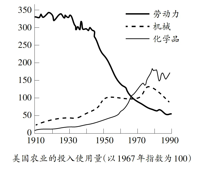 【解析】据材料1910年美国农业的劳动力投入指数高达约350,随着机械投入、化学品的增加,劳动力投入指数锐减,得出农业生产机械化、化学肥料的使用节约了劳动力,农民不再花费大量精力耕作、照管农作物,极大提高了生产效率,故选B项;机械化作业有利于农业集约化程度的提高,不断提高土地生产率和劳动生产率,排除A项;生态环境问题是多种因素影响的结果,不单是化学品造成的,排除C项;美国是世界上最大的粮食出口国,美国农业主要依靠现代科技的推动,排除D项。