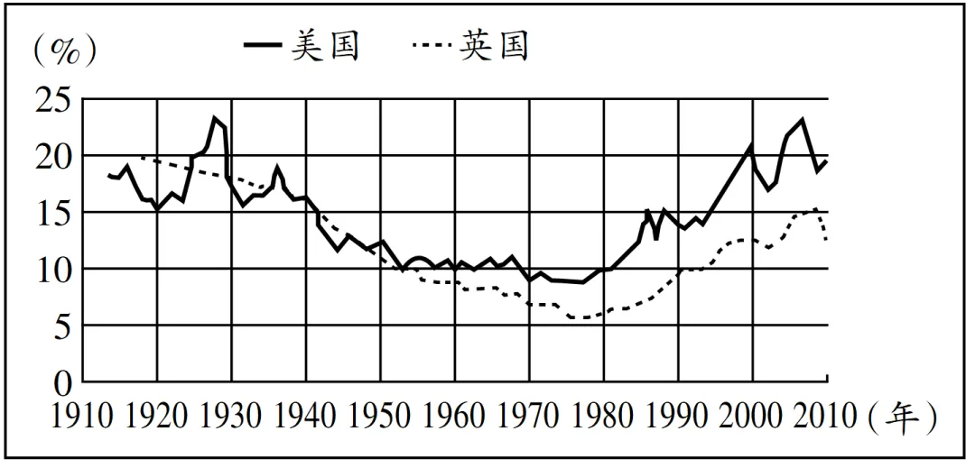 【解析】二战后,英、美等国推行“福利国家” 制度,旨在通过社会福利政策缩小贫富差距,但从图表中可以看到,英美两国最富裕的1%人口所占国家财富的比例,在经历一段时间的下降后,又呈现上升趋势,这表明 “福利国家” 制度并没有从根本上解决贫富分化的问题,故选C项;图表主要体现的是英美最富裕的1%人口占国家财富比例的变化,并未涉及科技进步对英美富人收入差距的影响,且英美两国具体的曲线变化趋势不完全一致,所以不能简单归因于科技进步,排除A项;图表只反映了最富裕的1%人口的财富占比,没有涉及“中间阶层”的变化,无法得出中间阶层扩大是否改变社会结构的结论,排除B项;虽然20世纪80年代后财富的不平等加剧,但“滞胀”主要发生在20世纪70年代,而图表中不平等加剧的趋势在20世纪90年代后仍在持续,所以不能仅归因于“滞胀”,排除D项。