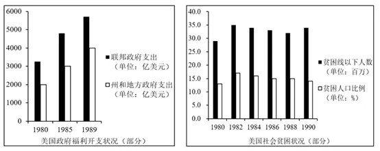 【解析】据材料可知,20世纪80年代,美国政府福利开支大幅度上升,而社会贫困状况中,贫困人口比例和贫困线以下人数却逐渐上升,这说明当时社会福利制度并没有发挥有效作用,社会福利开支增加的同时贫困状况并没有缓解,故选D项;材料中没有社会财富各阶层占有的数据,得不出“不断扩大”的结论,排除A项;福利制度没能触动资本主义生产资料所有制,排除B项;材料只涉及到了美国政府福利开支,不涉及“自下而上的机制”,且二战后,西方各国的基层自治进一步发展,各国政府都认识到,要提高生活品质,改善人民生活,不能单靠政府,需要组织和鼓励当地居民参与,建立自下而上的机制解决社会问题,排除C项。