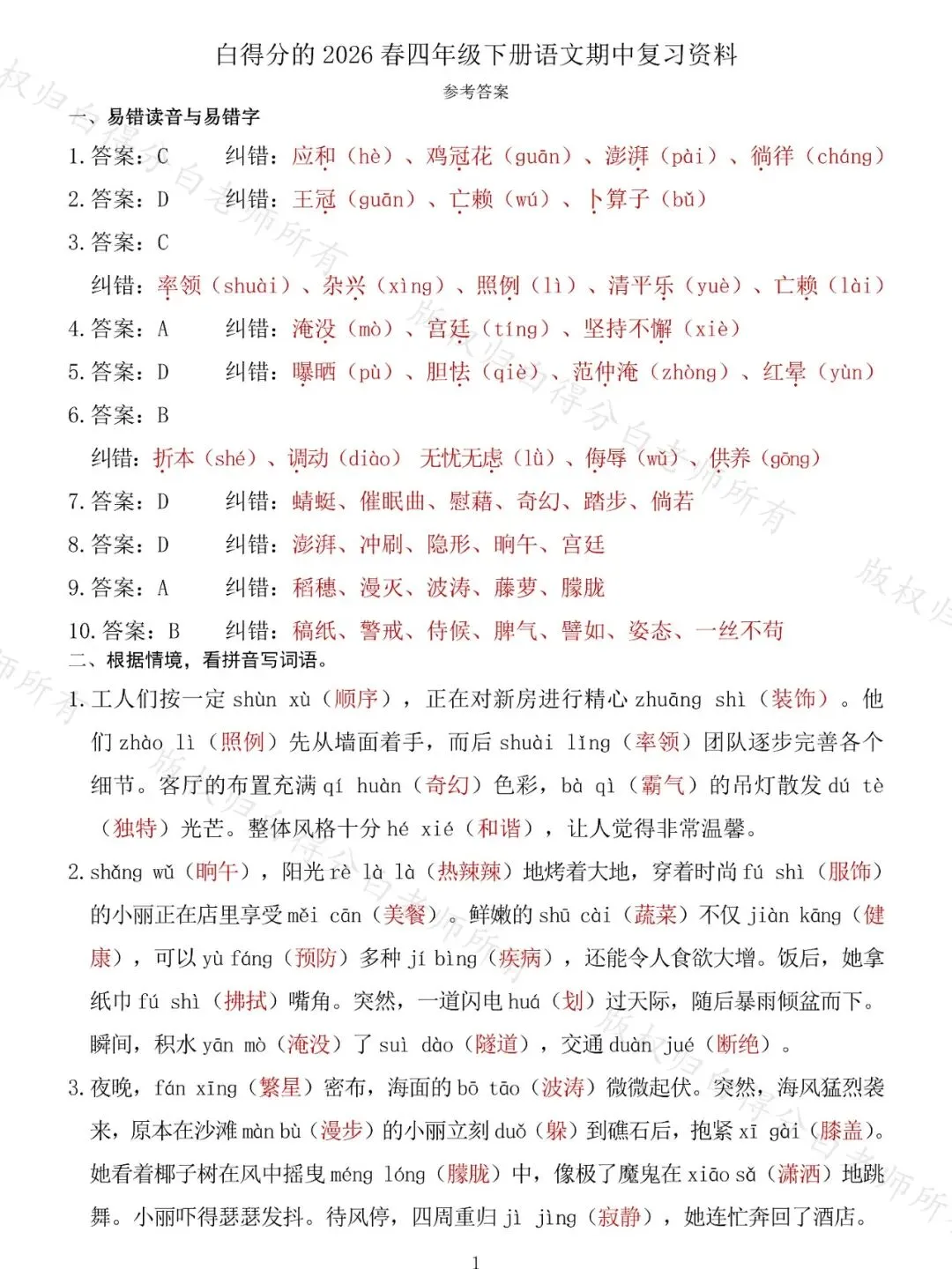 都有答案,包括14页期中专项练习,3页三篇备考作文,一份6页A4期中练习(卷),具体专项有:结合选择题做题方法的易错读音、易错字、修改病句、判断说明方法与修辞手法,背诵与默写、课文理解填空、园地词句段运用、根据语境看拼音写词语、口语交际,还有阅读题五篇,快乐读书吧重要考点练习,结合纠错分析的古诗词注释,习作考前辅导。精选精练,助力四年级的学生们在期中测试中取得好成绩。