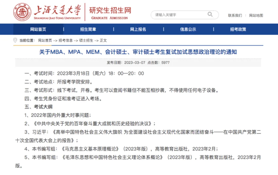 上海交通大学已经发布复试时间——3月18日,复试真的要来了!有两所学校初试成绩出错,考生复核成绩成功~接下来就要着重准备复试啦,复试相关注意事项小编已放在文后,敬请参考!上海交通大学研究生招生网发布《关于MBA、MPA、MEM、会计硕士、审计硕士考生复试加试思想政治理论的通知》,通知表明2023年3月18日(周六)18:00-20:00进行复试!