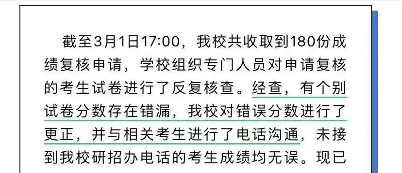 截至目前,又有两所院校发布通知,表明成绩有误,因此对成绩存疑的同学一定要在规定时间内提出成绩复核申请!但是目前复核时间已经基本结束,所以大家还是需要把重点放在准备复试及调剂上。海南师范大学通知:经查,有个别试卷分数存在错漏,我校对错误分数进行了更正,并与相关考生进行了电话沟通,未接到我校研招办电话的考生成绩均无误。