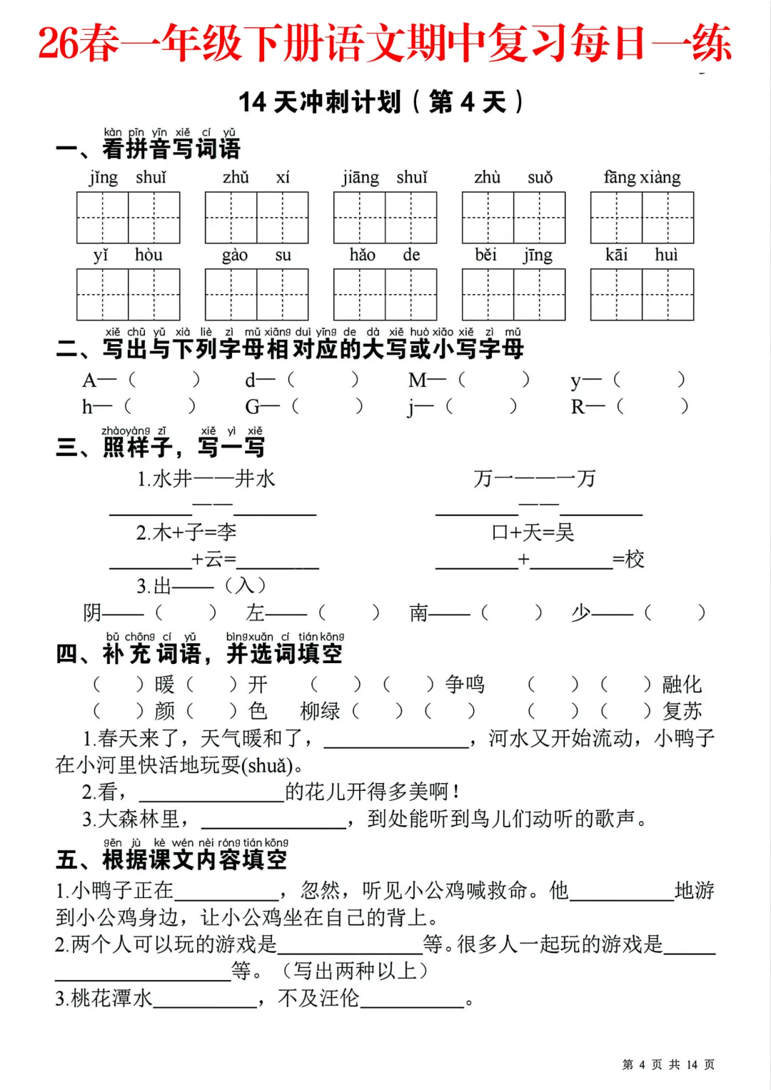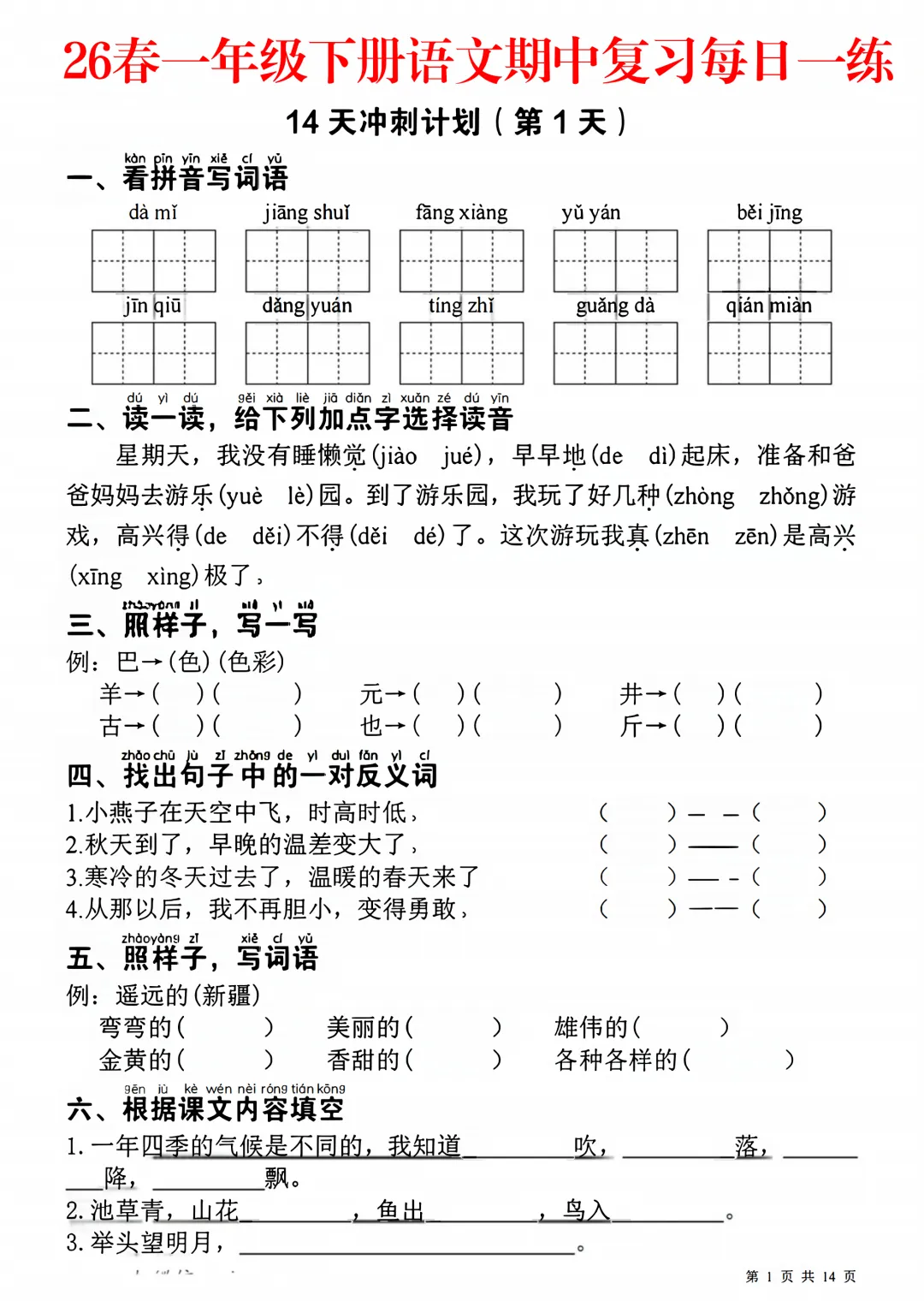 26 春一年级语文下册《期中复习冲刺计划每日一练小纸条含答案》来啦✨按天规划期中必考点,生字注音、看拼音写词语、笔顺笔画、形近字、反义词、古诗日积月累、简单阅读全覆盖。小巧便携,每天一张轻松练,附带完整答案,晨读晚默、考前突击超方便,基础扎实不丢分💯
