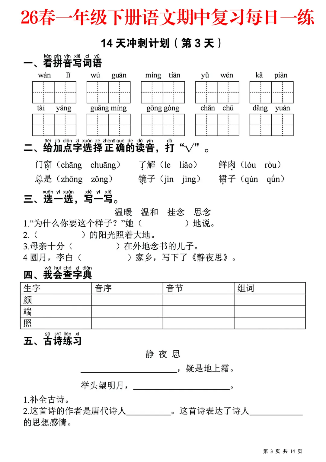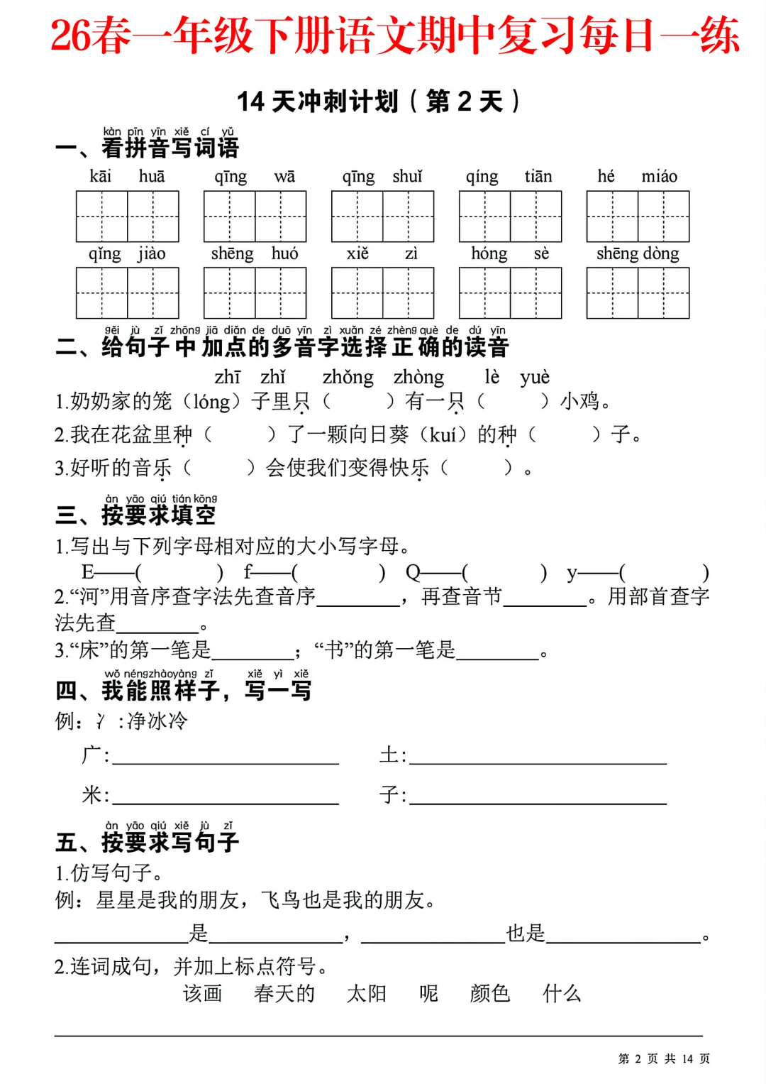 #一年级语文#一下语文#期中复习#期中冲刺#每日一练#语文小纸条#基础默写#期中练习#含答案练习#小学语文复习