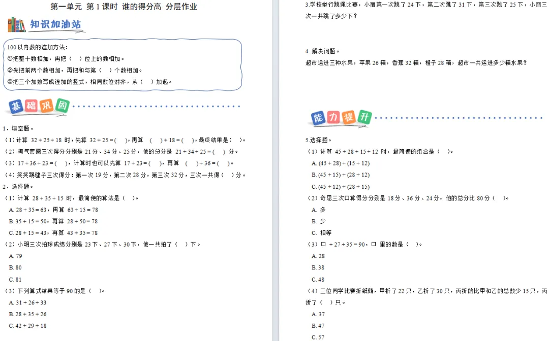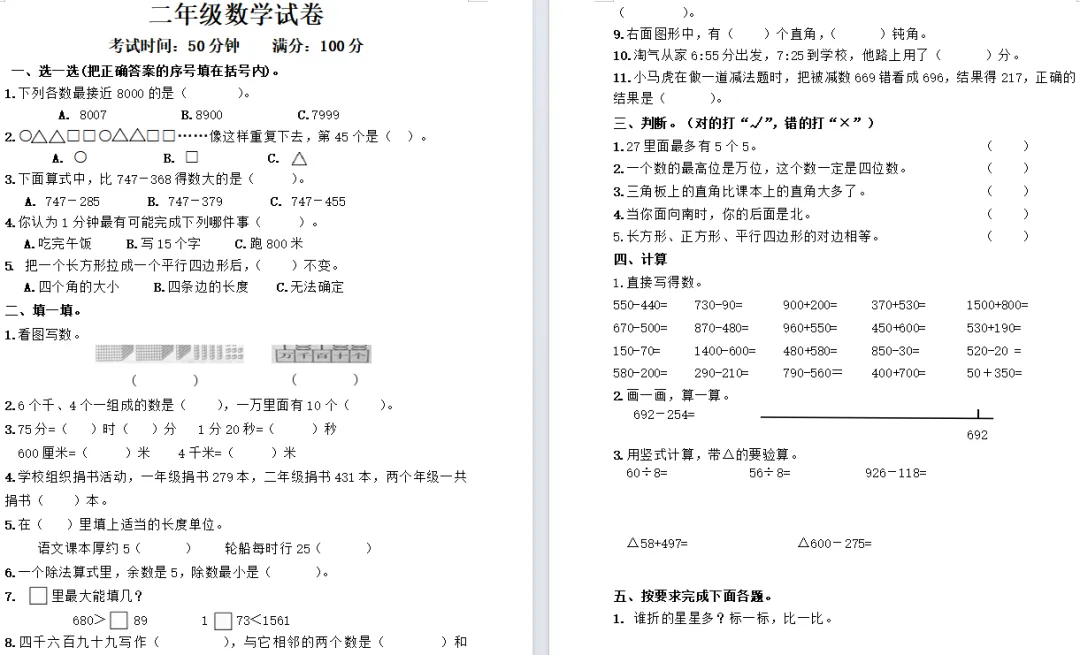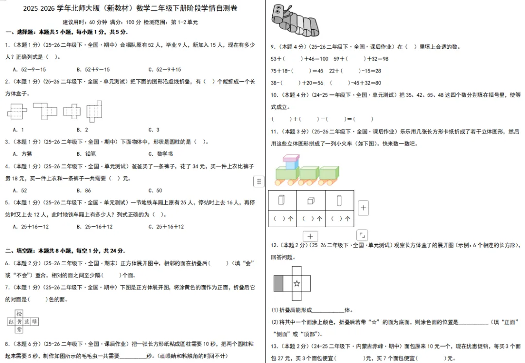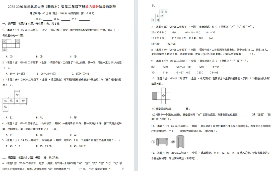 【复习资料】2026春 北师大版小学二年级数学下册 同步练习+单元测试+期中测试+期末测试+月考试卷(全套下载) 可编辑打印
