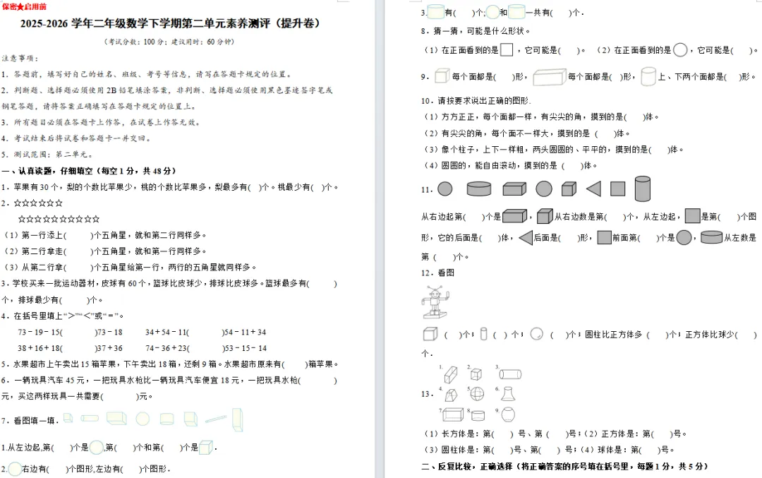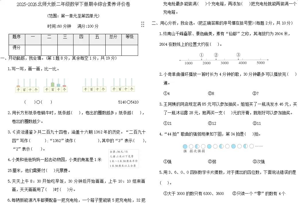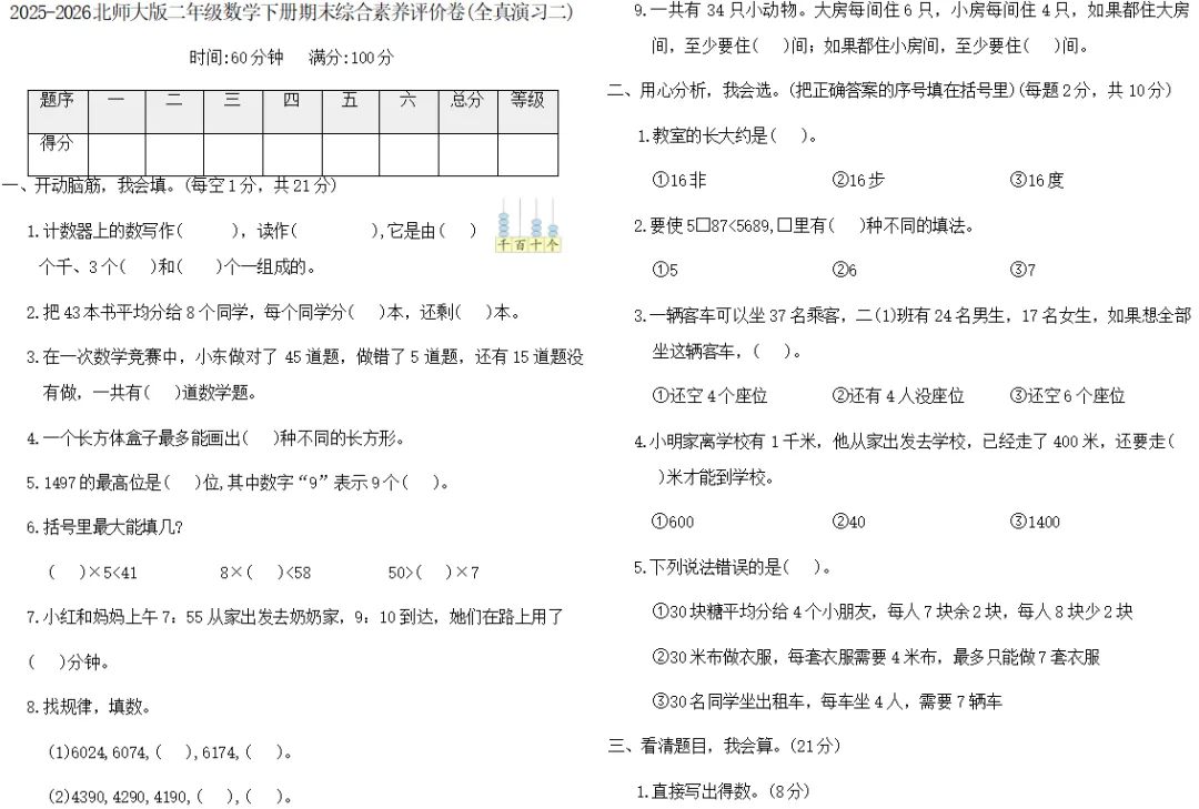 >【复习资料】2026春 北师大版小学二年级数学下册 同步练习+单元测试+期中测试+期末测试+月考试卷(全套下载) 可编辑打印