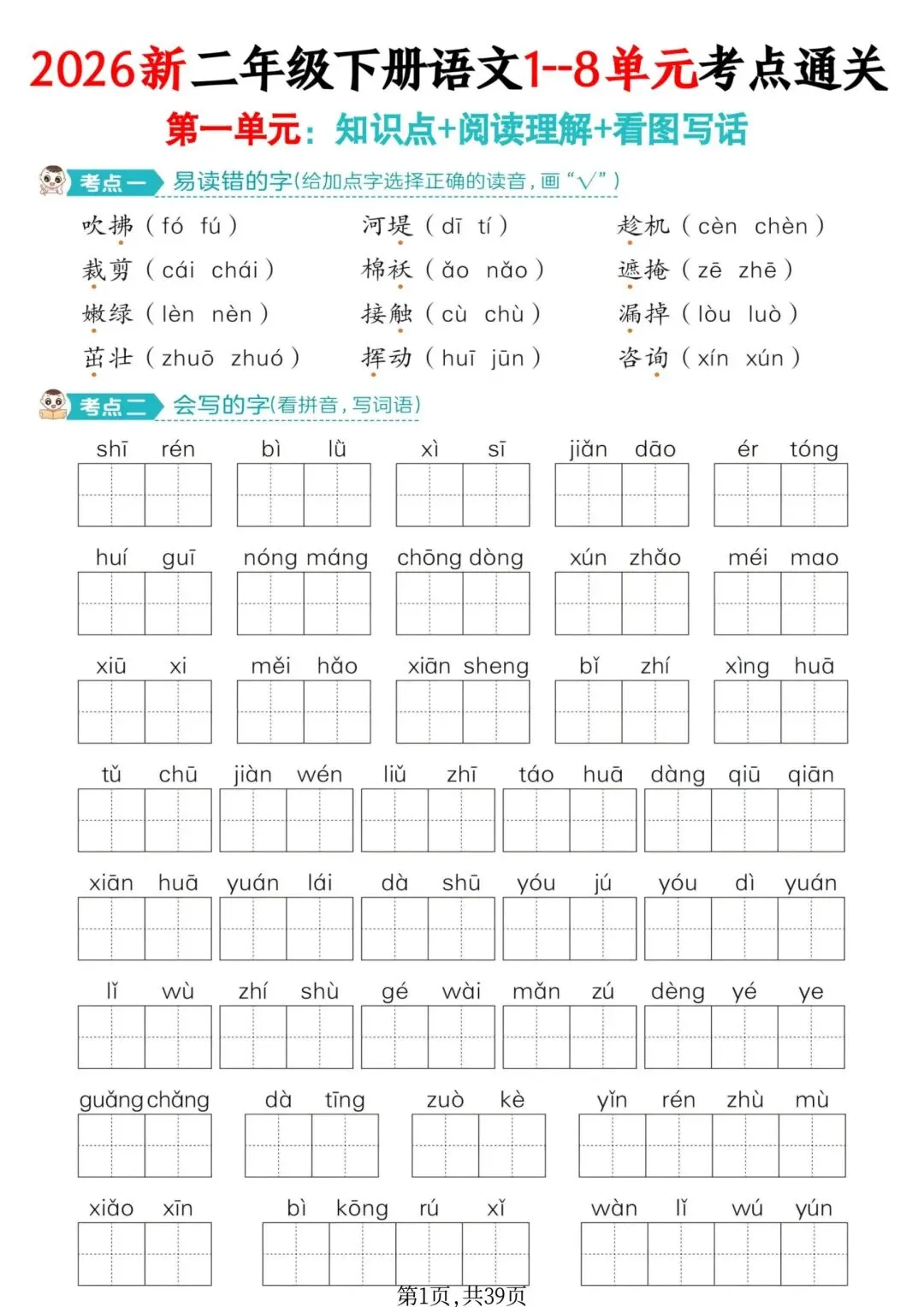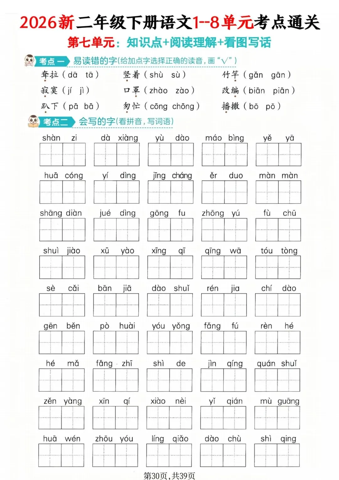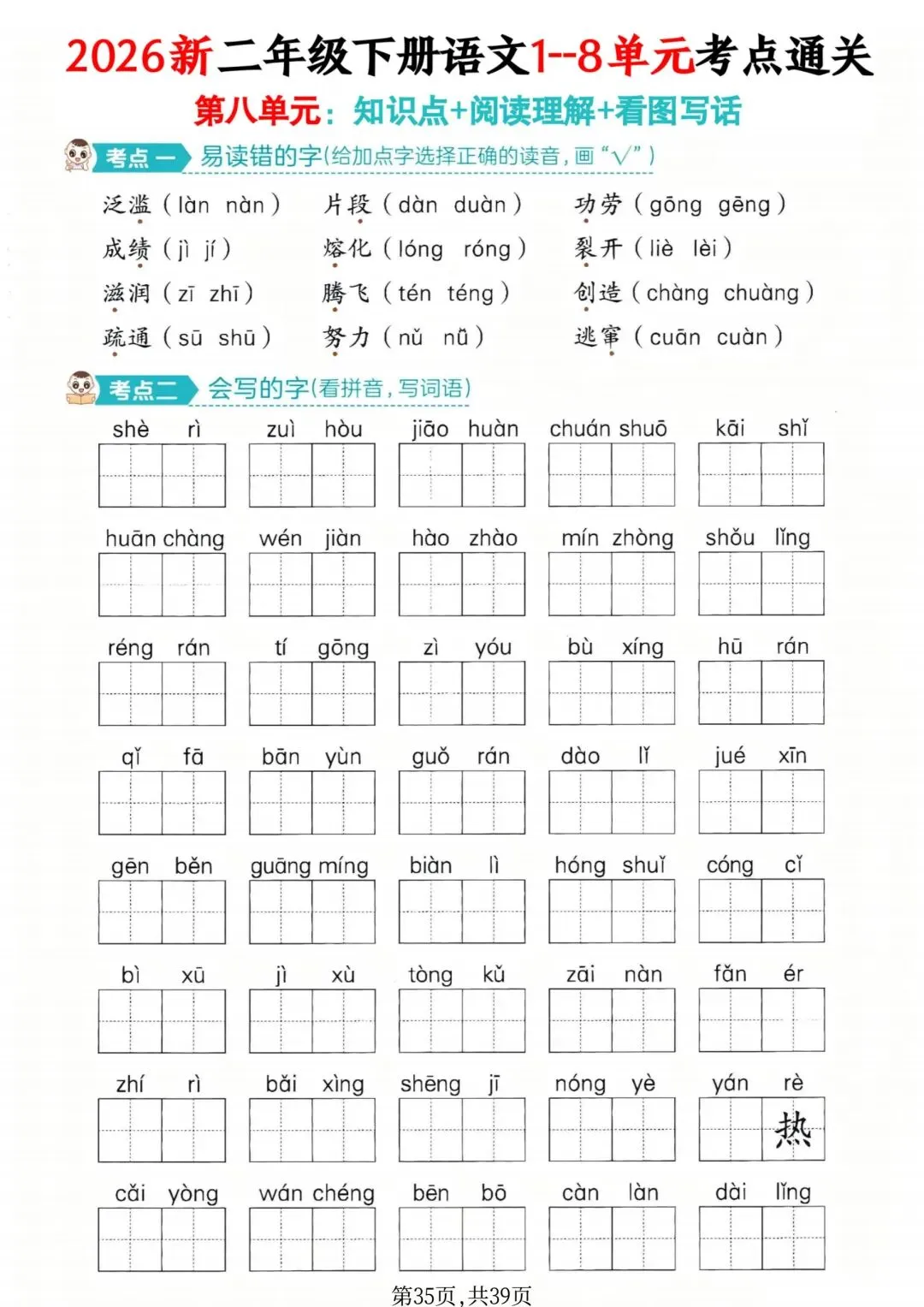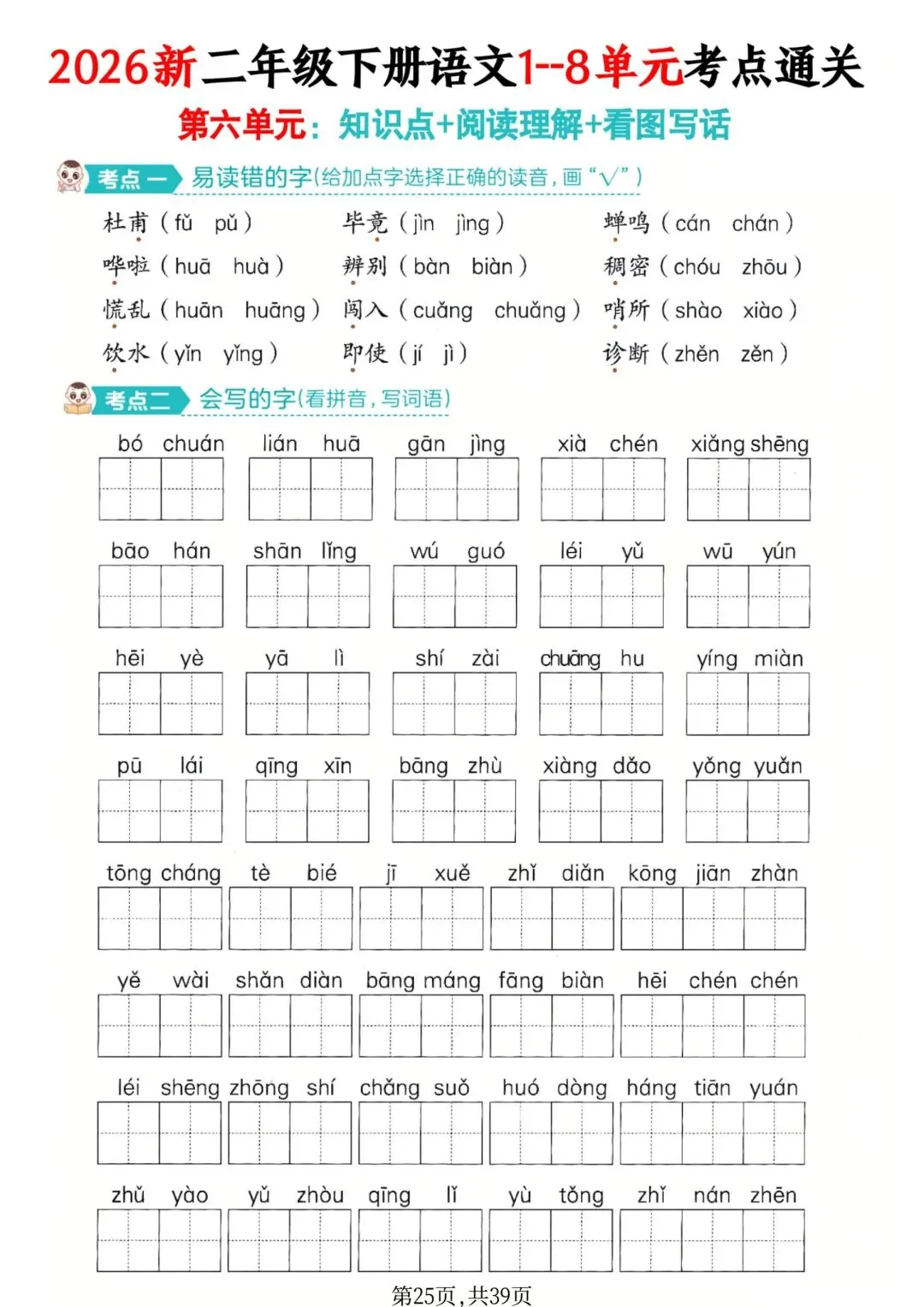 二年级语文下册1-8单元考点通关复习资料,速存!