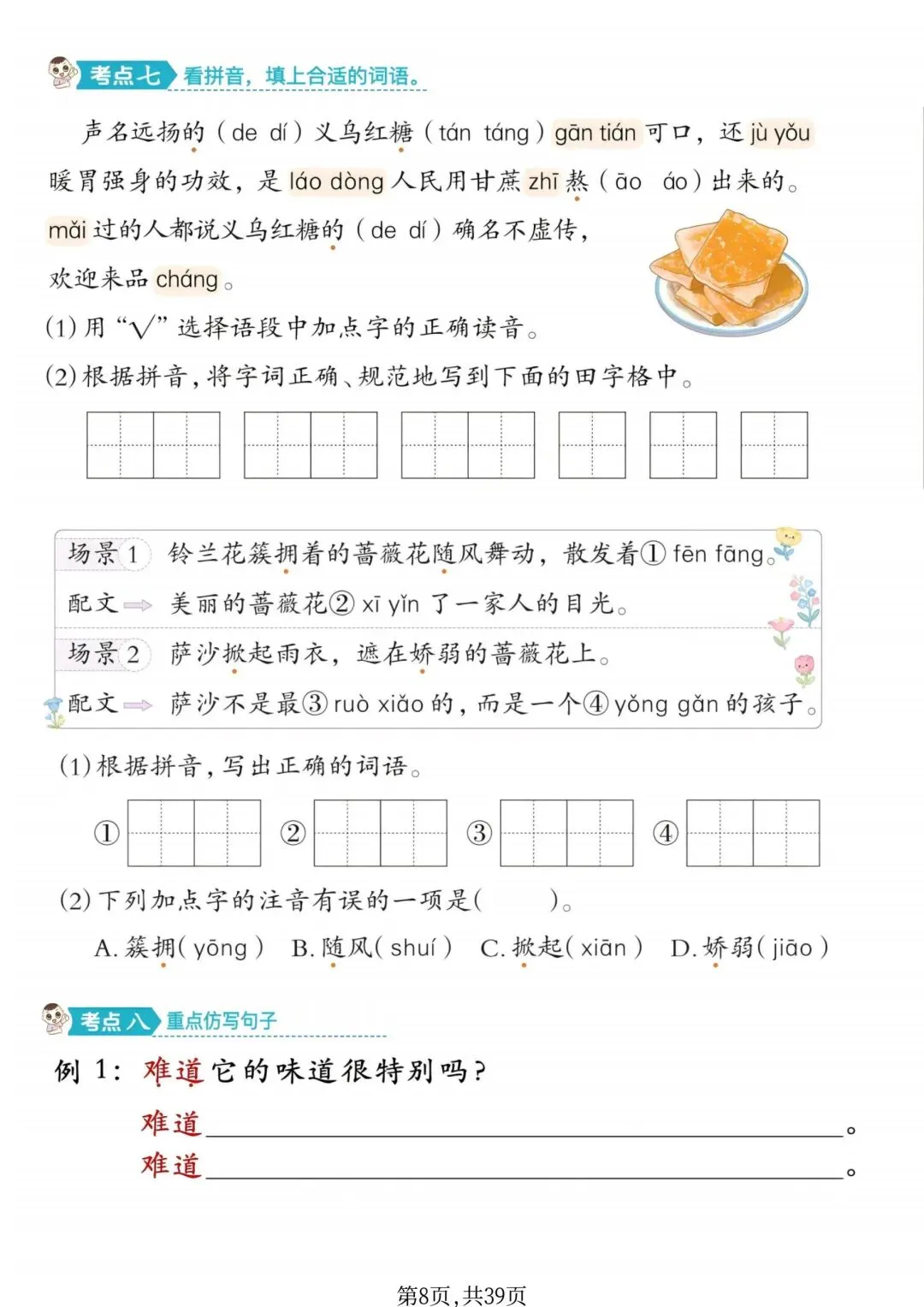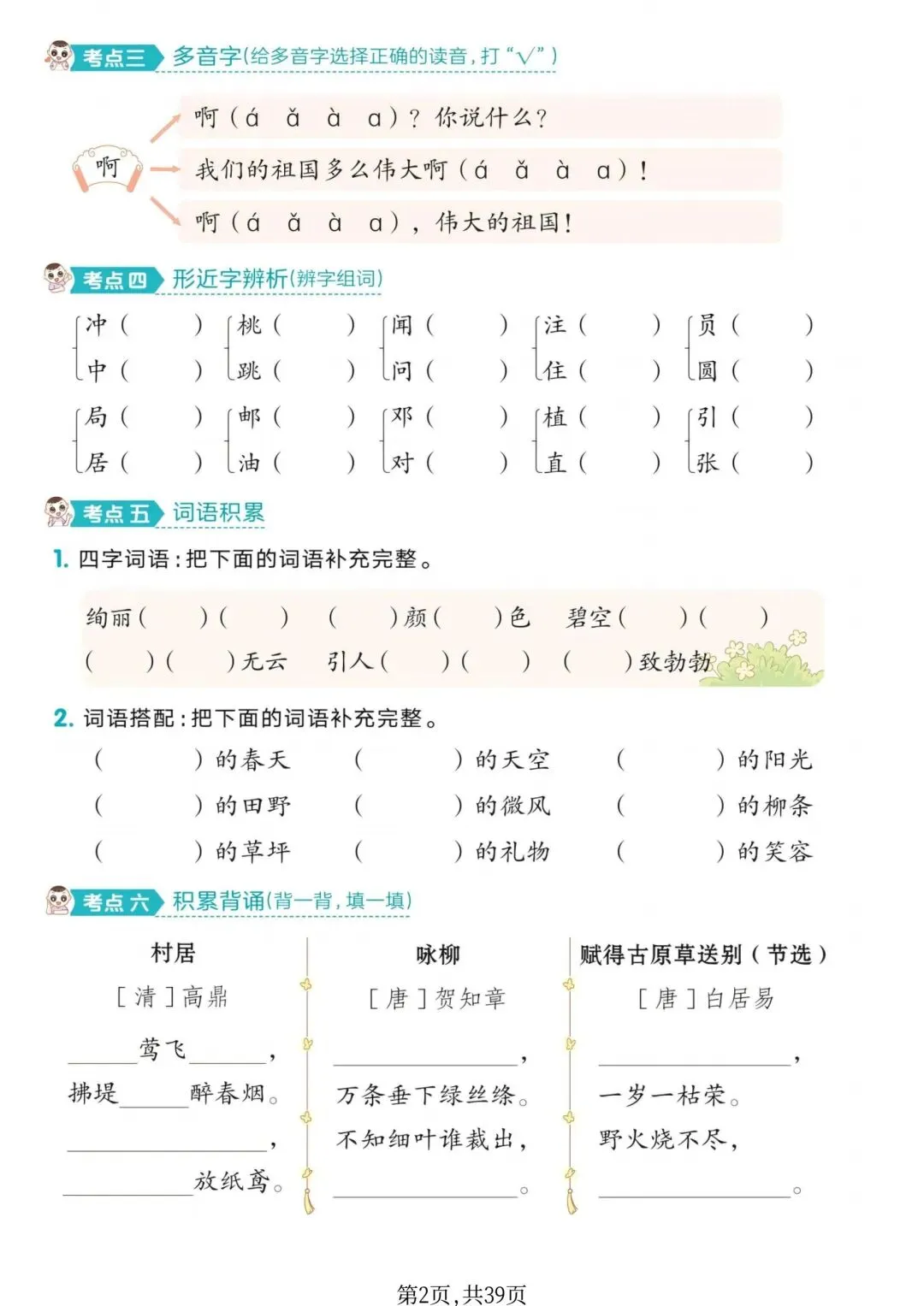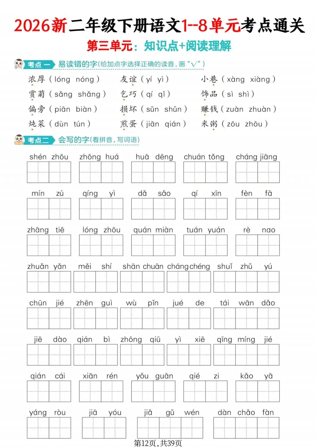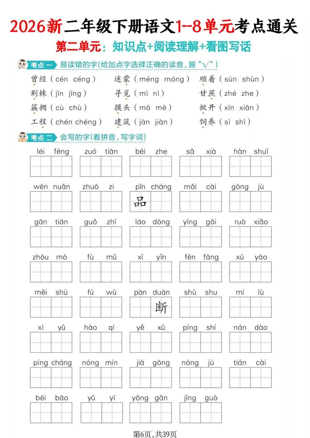 二年级语文下册1-8单元考点通关复习资料,速存!