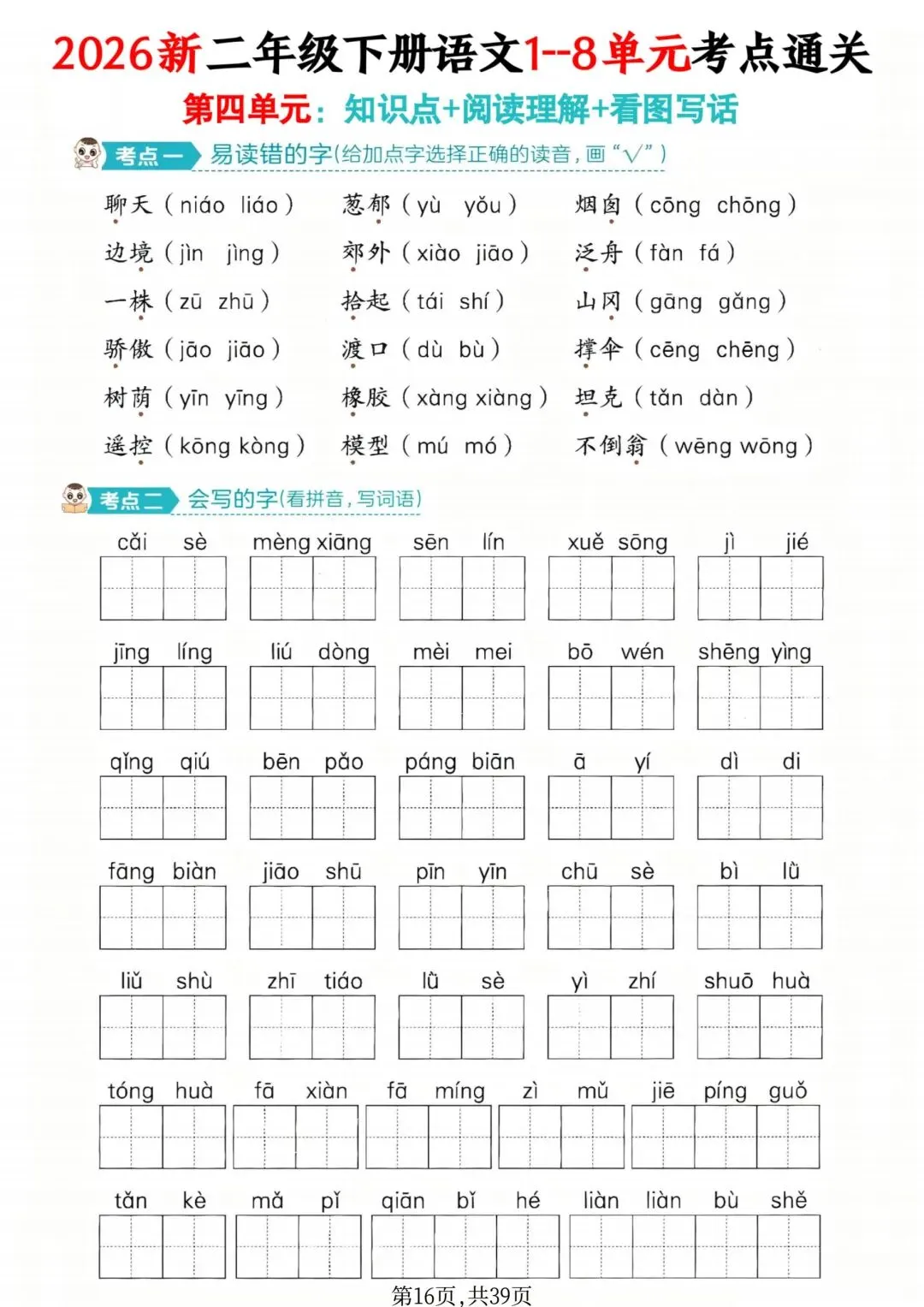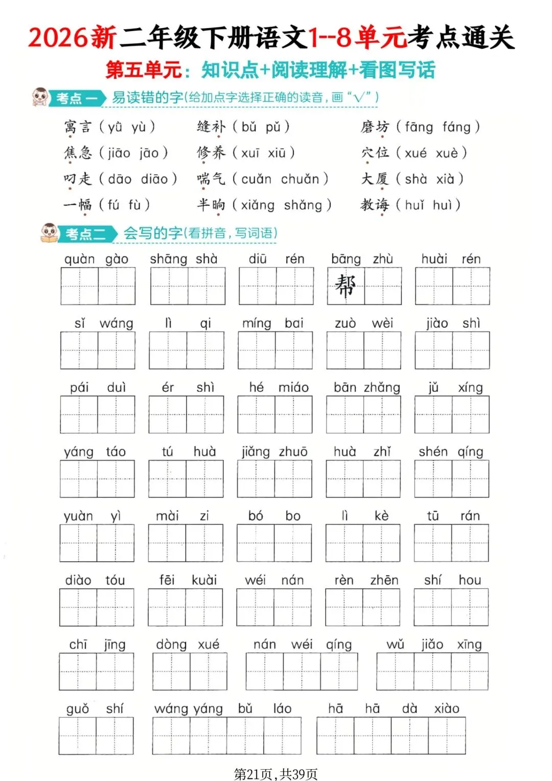 >二年级语文下册1-8单元考点通关复习资料,速存!