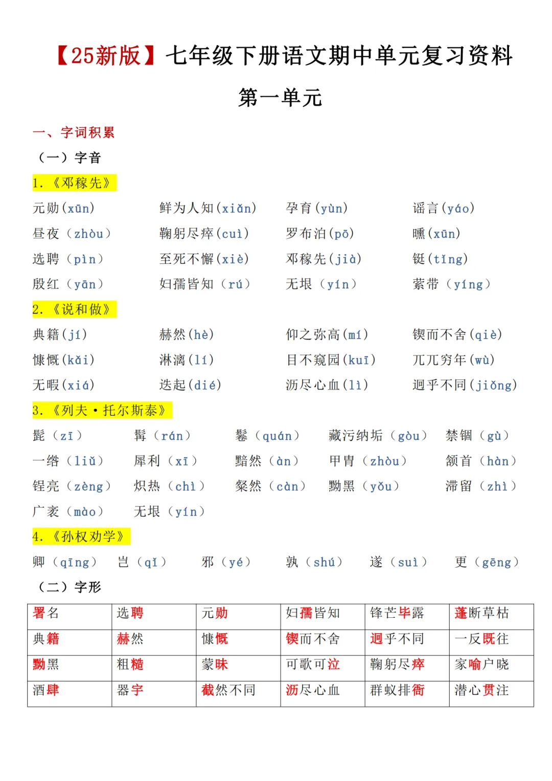 今天老师给大家整理了:七年级下册地语文期中单元复习资料(详),电子打印版!