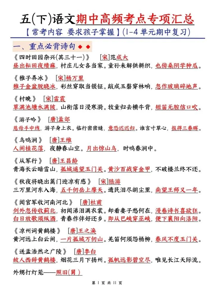 期中考试临近,五年级的同学们语文复习有没有抓不住重点?