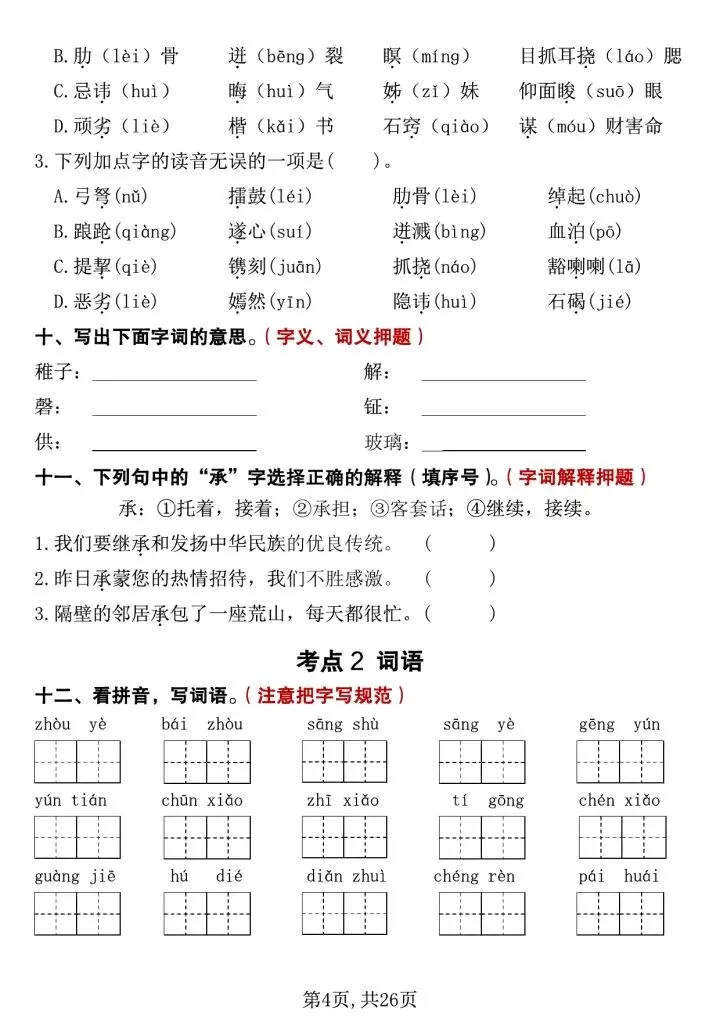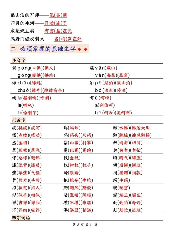 ✅ 基础字词:1-4单元重点生字、多音字、形近字、词语听写、近反义词、成语积累全汇总,夯实语文基础不丢分