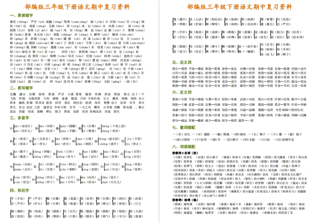 部编版语文三年级下册1-5单元复习资料,迎考期中!