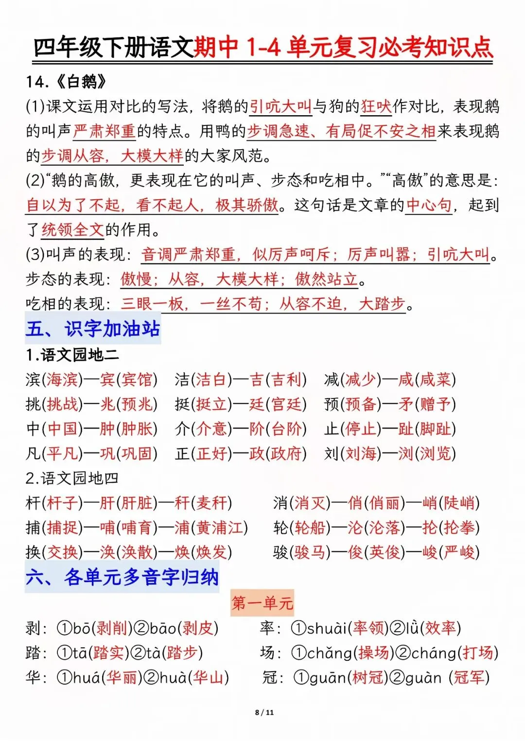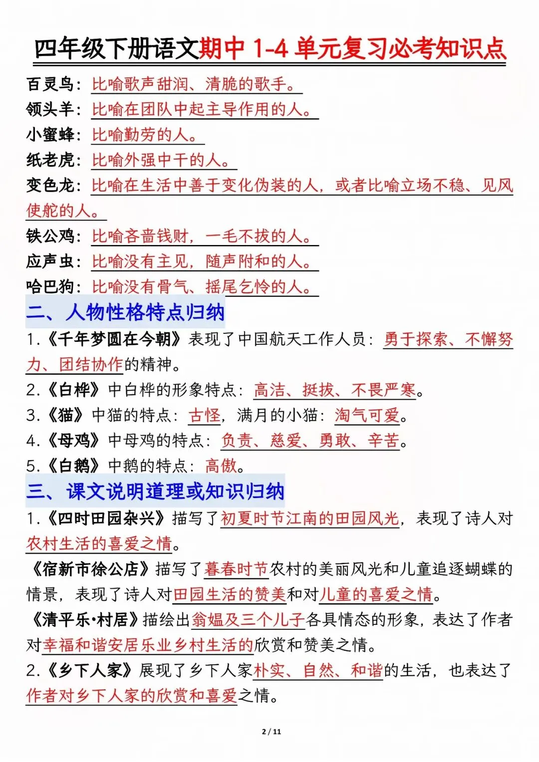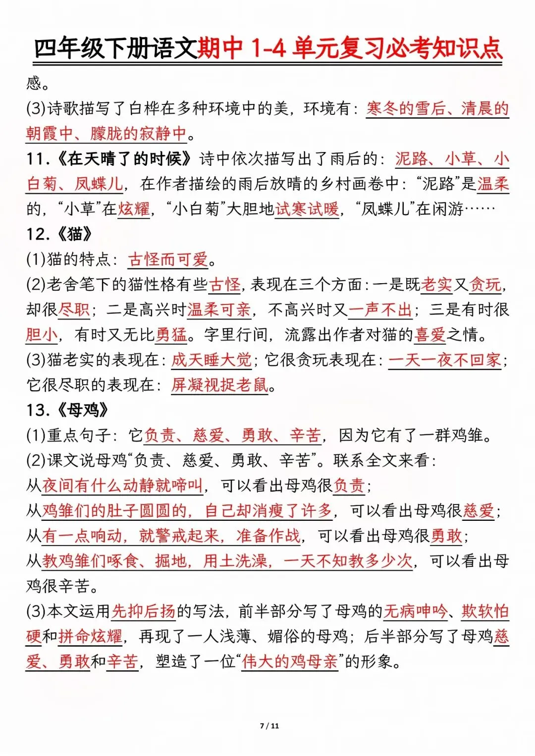 26年人教版四年级下册语文期中复习资料,1-4单元高频考点归类汇总,电子版可打印下载。本资料系统梳理了前半学期核心内容,涵盖必背古诗文、人物性格分析、课文主旨道理、多音字及重点词语等模块,帮助孩子快速锁定复习重点,查漏补缺,有效提升期中备考效率。建议家长下载打印,供孩子考前集中背诵与巩固。