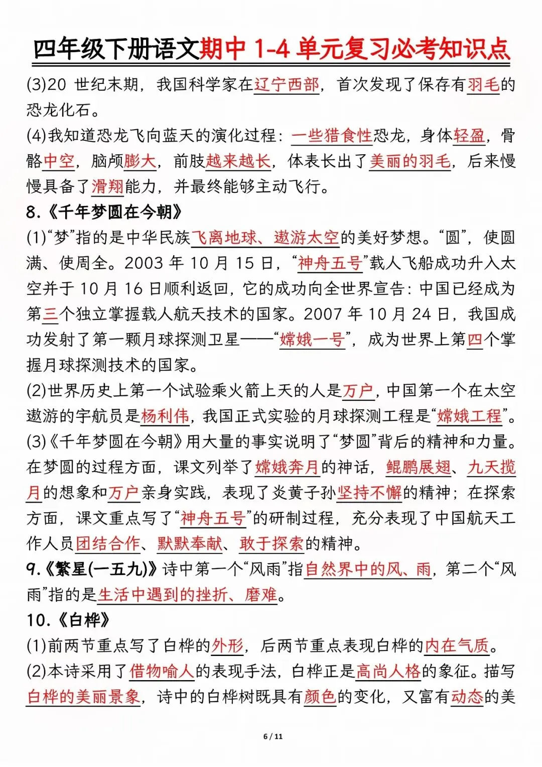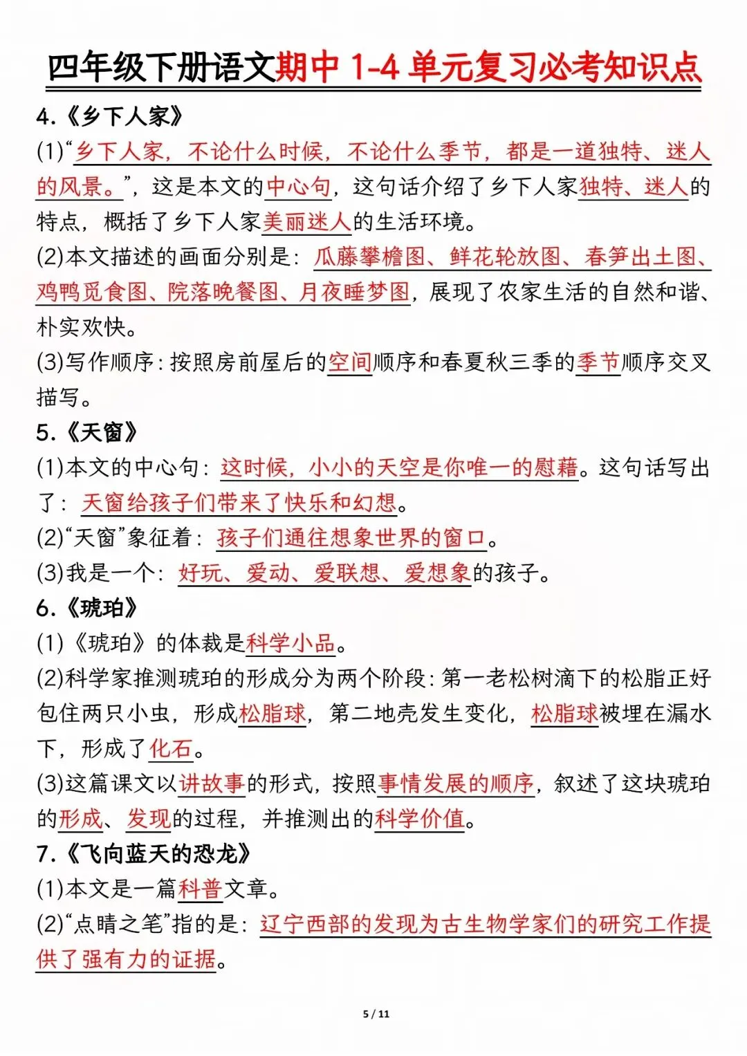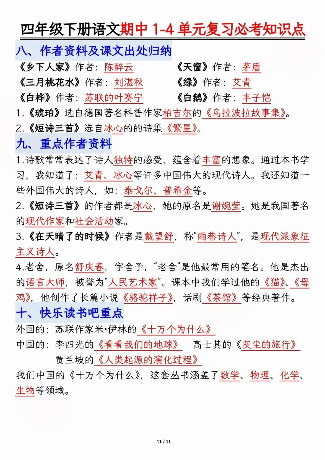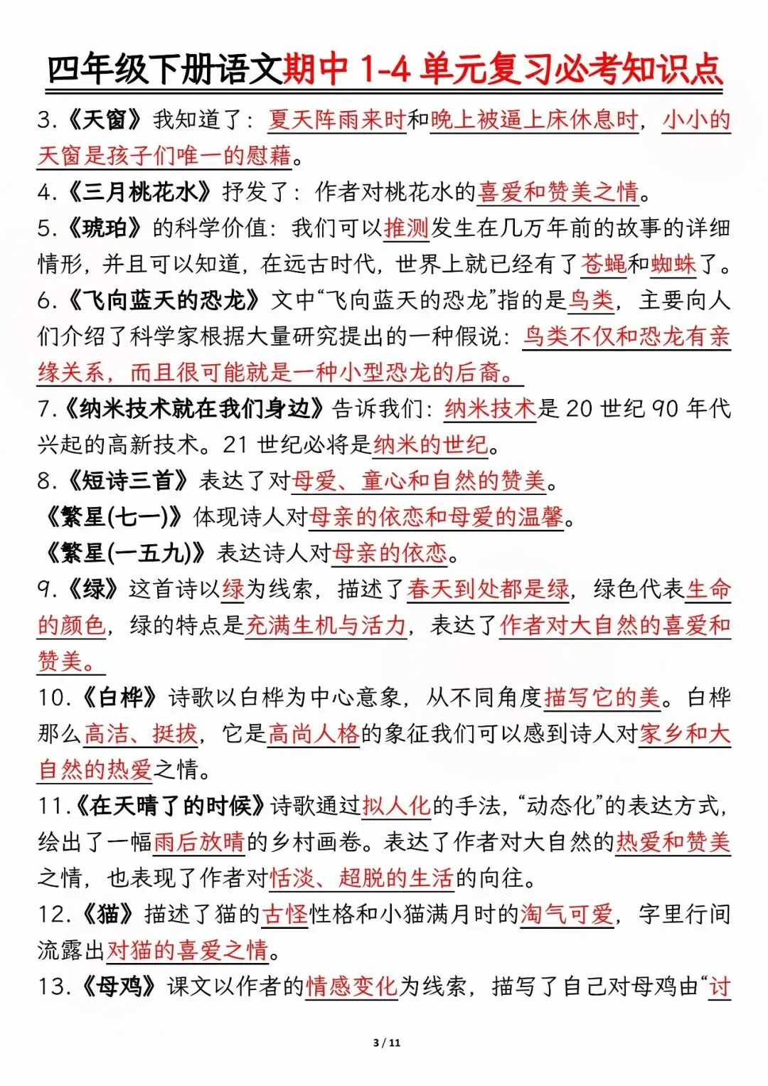 26年人教版四年级下册语文期中复习资料,1-4单元高频考点归类汇总,电子版可打印下载。本资料系统梳理了前半学期核心内容,涵盖必背古诗文、人物性格分析、课文主旨道理、多音字及重点词语等模块,帮助孩子快速锁定复习重点,查漏补缺,有效提升期中备考效率。建议家长下载打印,供孩子考前集中背诵与巩固。