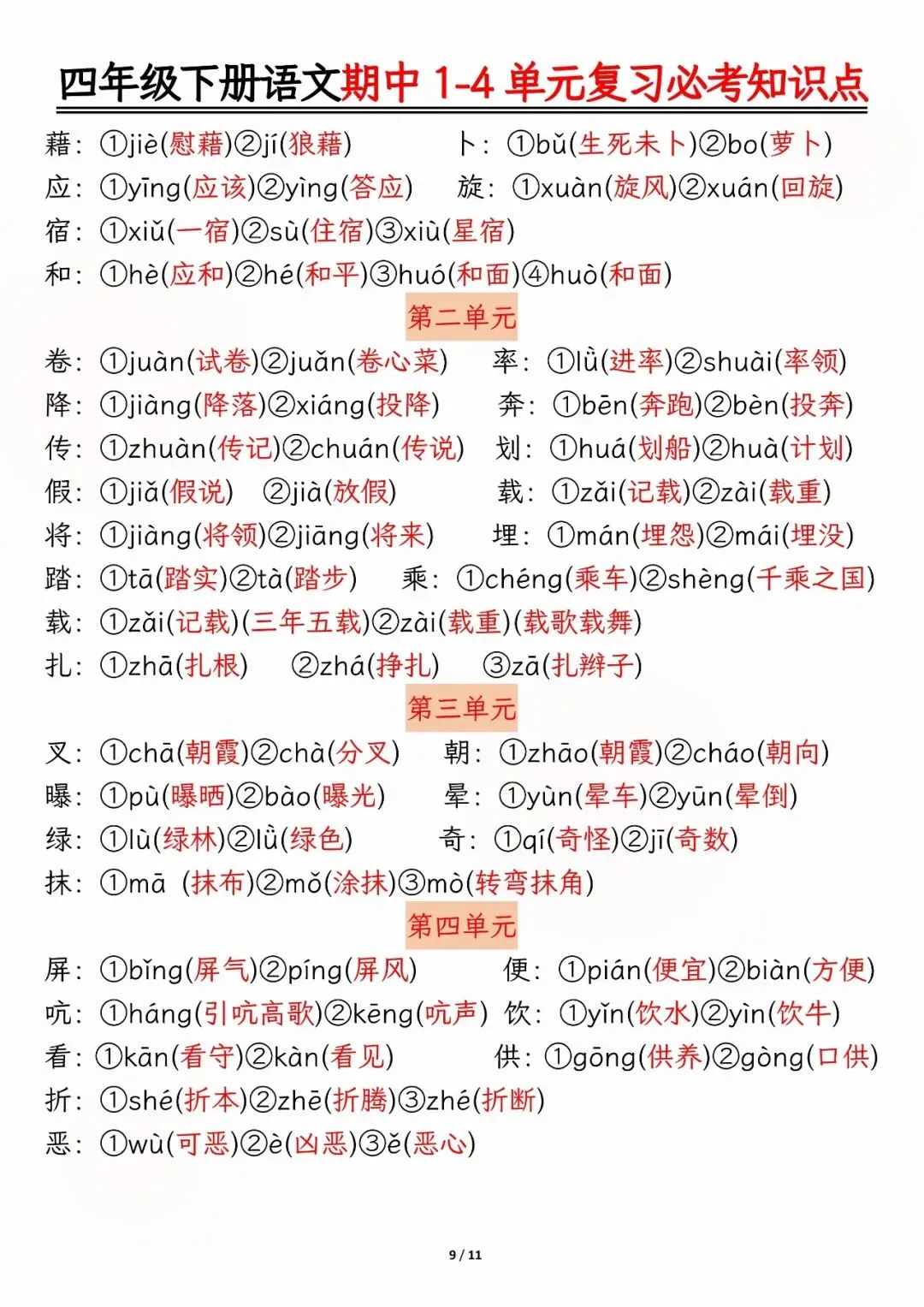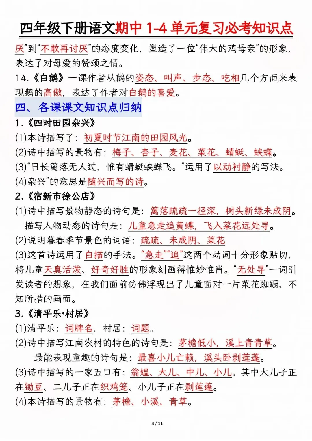 26年人教版四年级下册语文期中复习资料,1-4单元高频考点归类汇总,电子版可下载