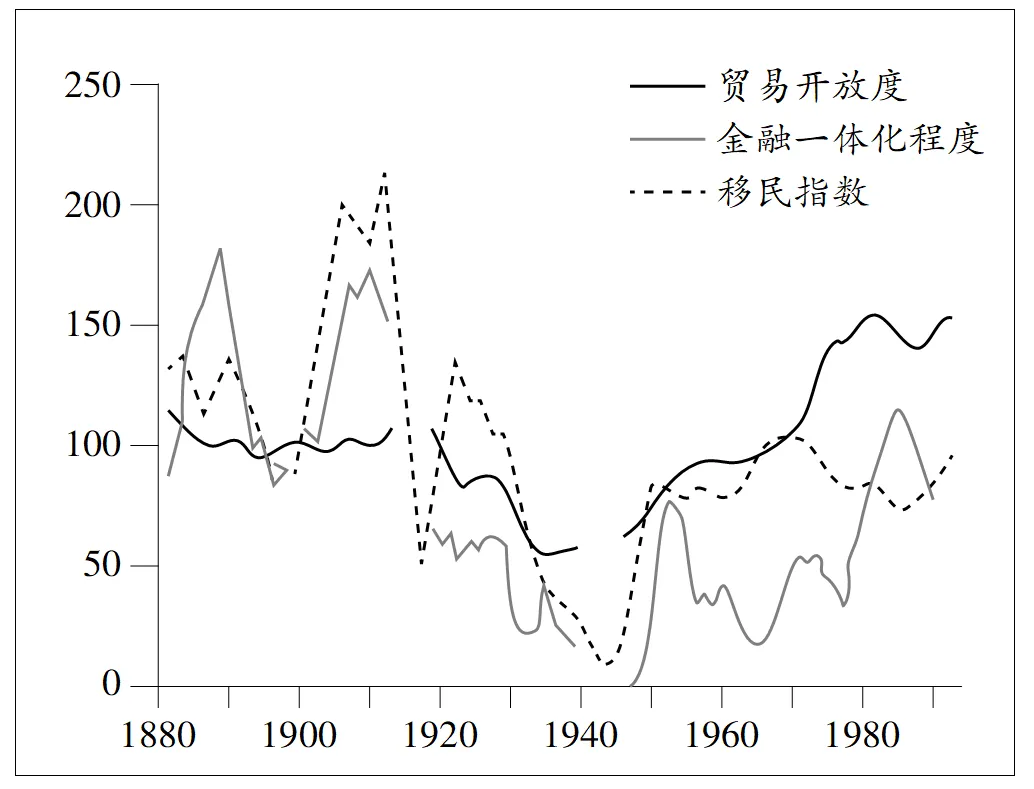 图4 世界贸易开放度、金融一体化程度、移民指数(以1900年为100)