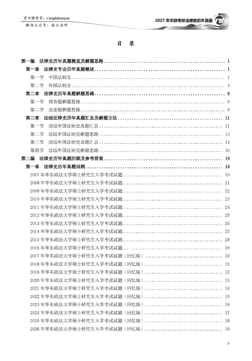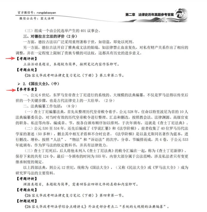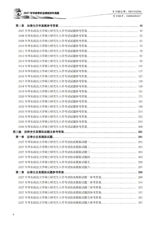 此本法律史历年真题完整摘录了自2002年至2026年的华政考研法律史专业真题,其中法律史历年真题参考答案给出了真题的【参考答案】,以及真题相关的【考题评析】,让各位考生明确每一年的真题中对应考点的出处,以及考试的形式,试题的难易等信息。但各位考生需要注意的是,学长所给出的参考答案并不是在考试中你必须写得完全一样的答题规范,也就是说各位考生写在考卷上的内容可以根据参考答案适当增加或减少,因此各位考生千万不要把参考答案作为答题的唯一标准。