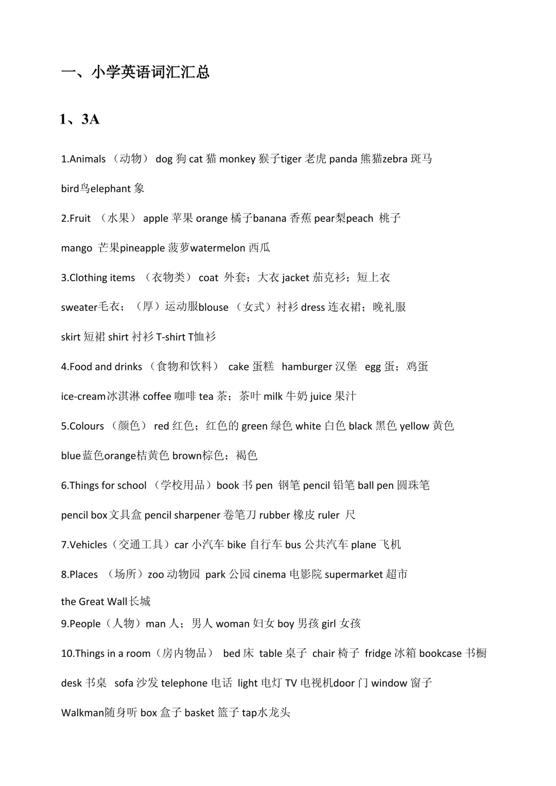 🐶 动物:dog, cat, monkey, tiger, panda, zebra, bird, elephant🍎 水果:apple, orange, banana, pear, peach, mango, pineapple, watermelon👕 衣物:coat, jacket, sweater, blouse, dress, skirt, shirt, T-shirt🎨 颜色:red, green, white, black, yellow, blue, orange, brown✏️ 文具:book, pen, pencil, ruler, rubber, pencil box