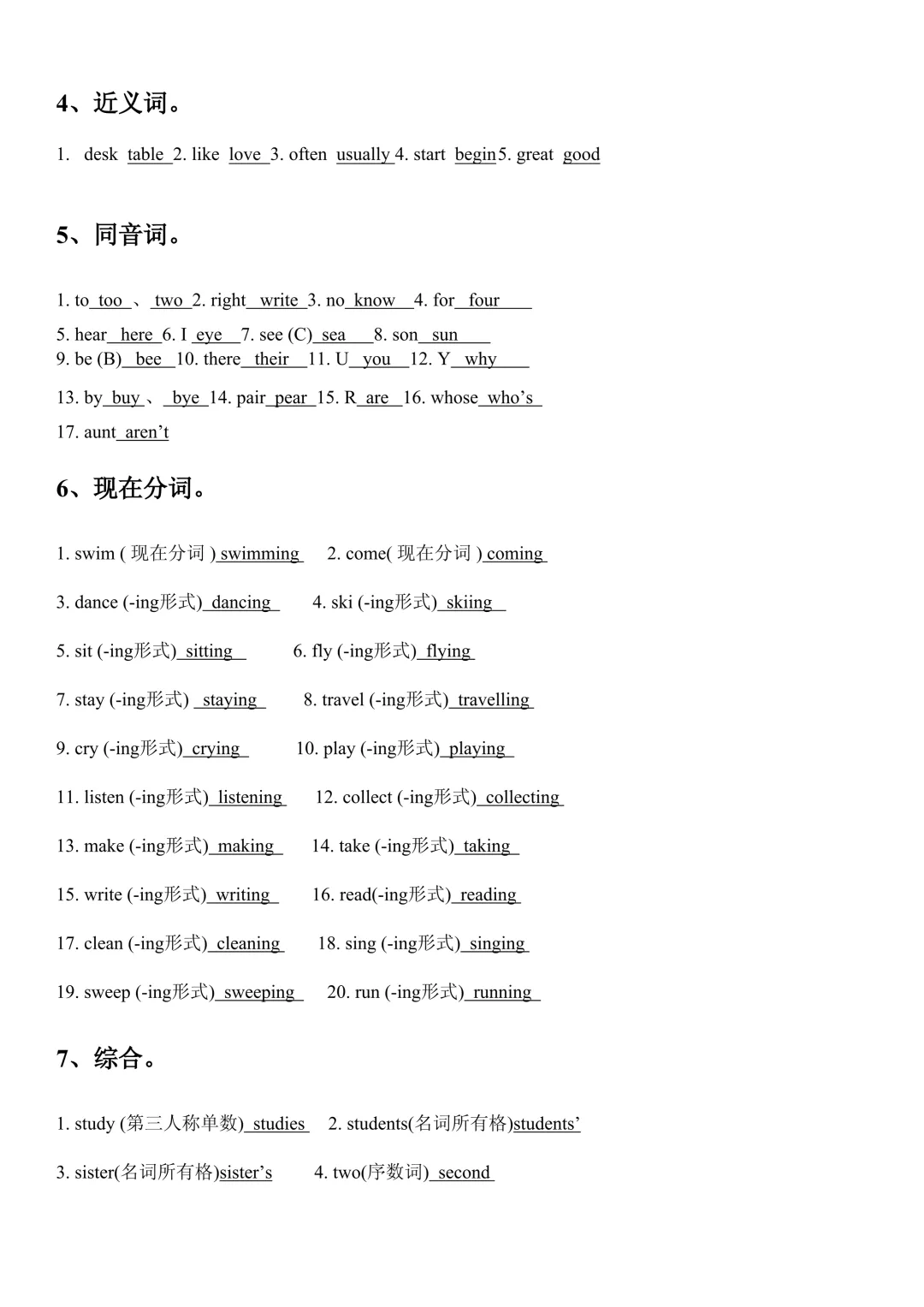 - 双写加:swim→swimming, run→running, sit→sitting