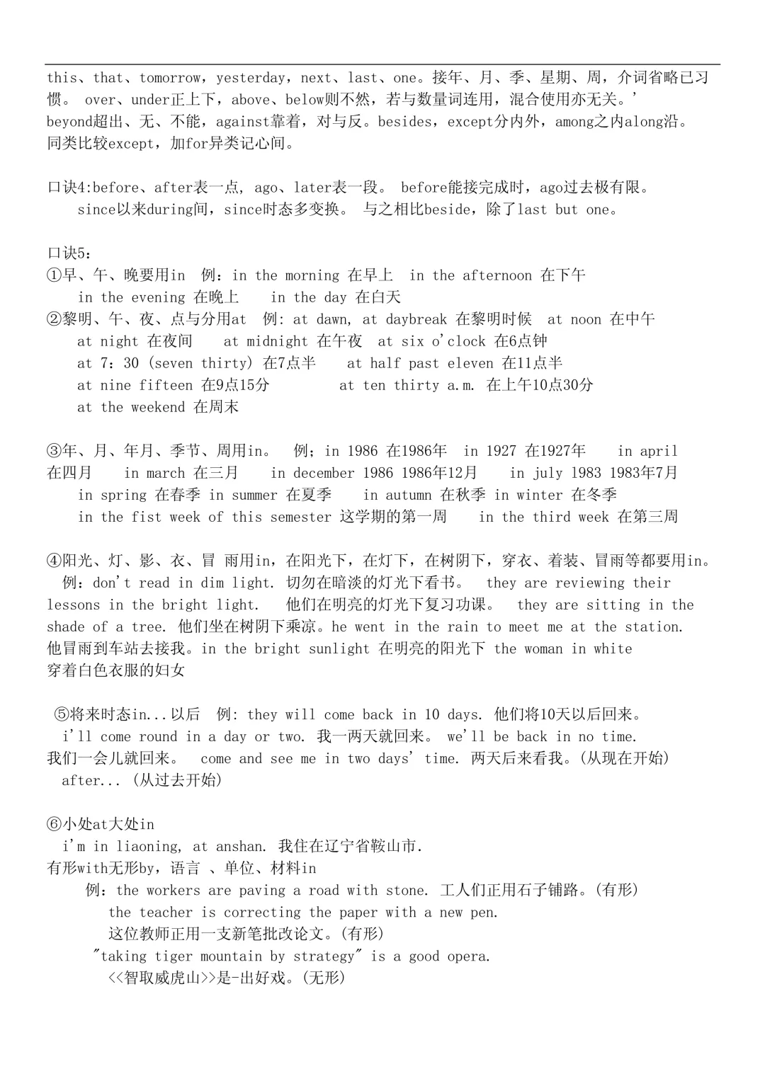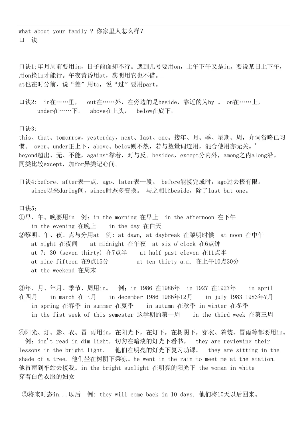 - 时间:at + 点钟,on + 具体日期,in + 年月季节