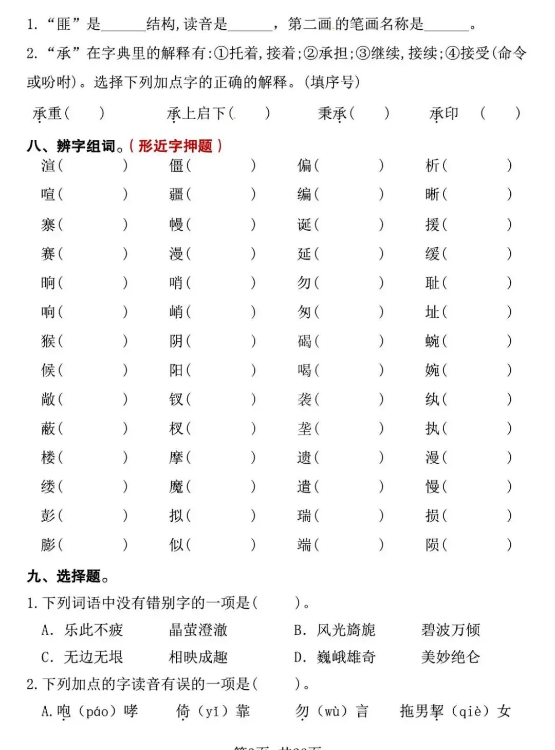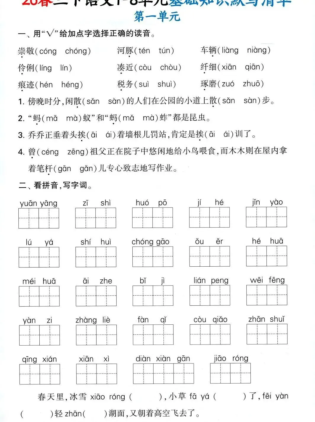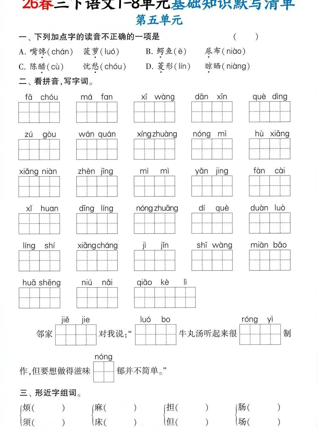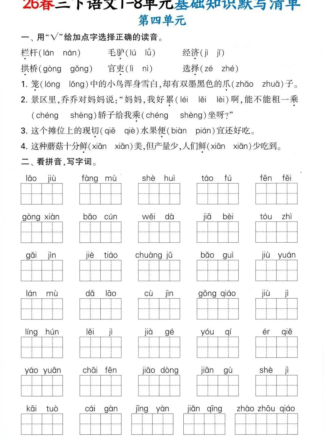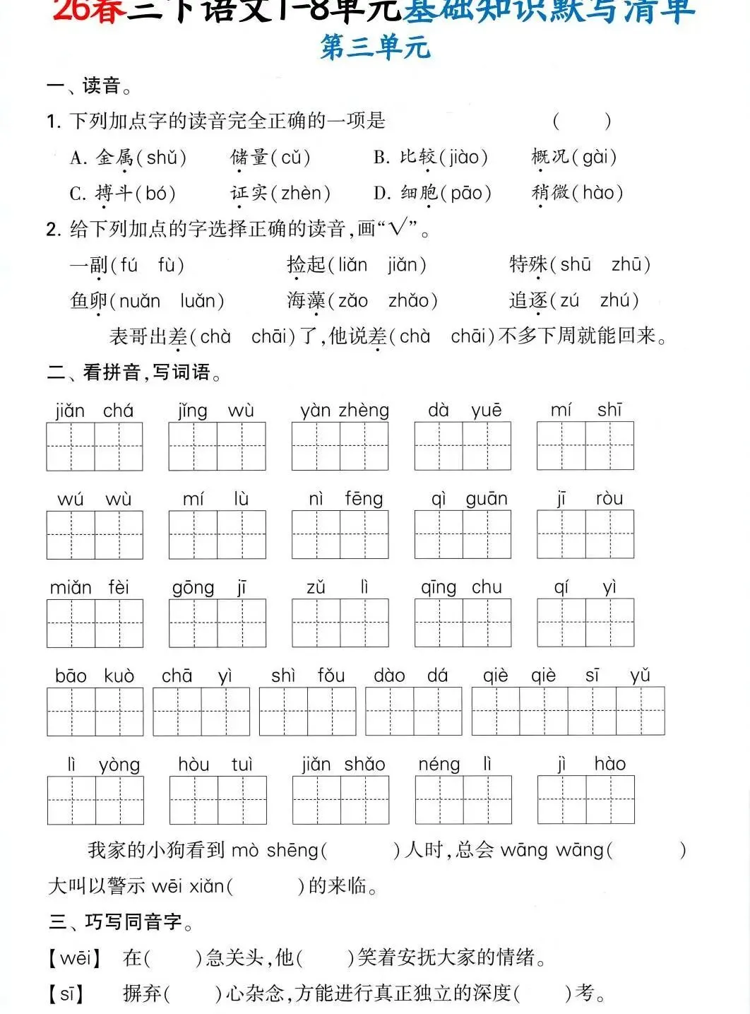 三下语文【26 春 - 1-8 单元基础知识默写清单(含答案 20 页)】.pdf