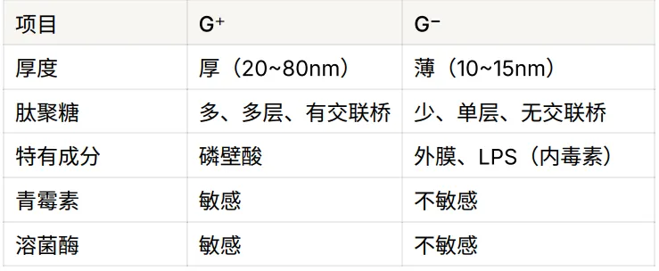 共同成分:肽聚糖(聚糖骨架、四肽侧链)