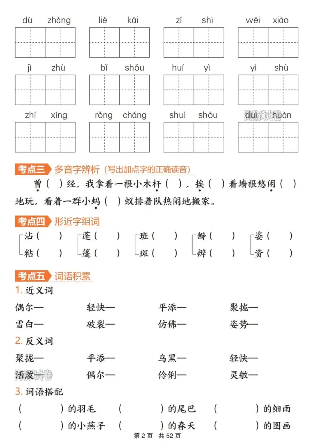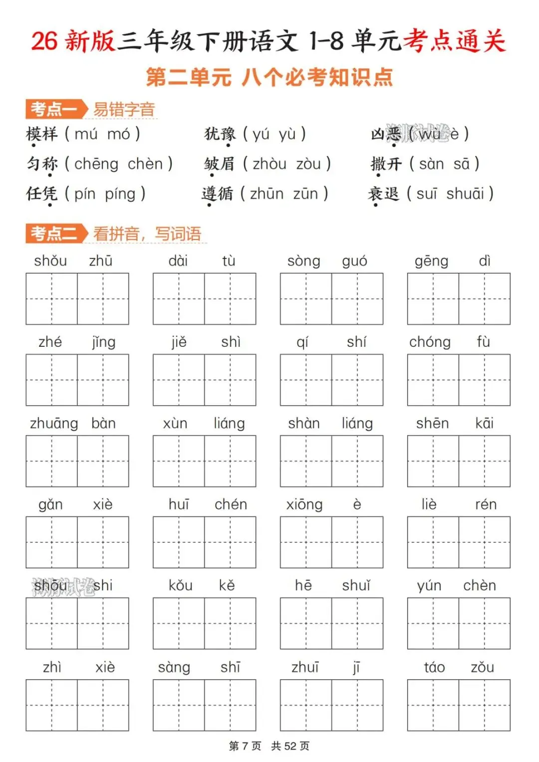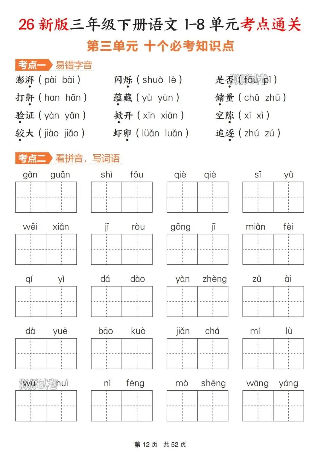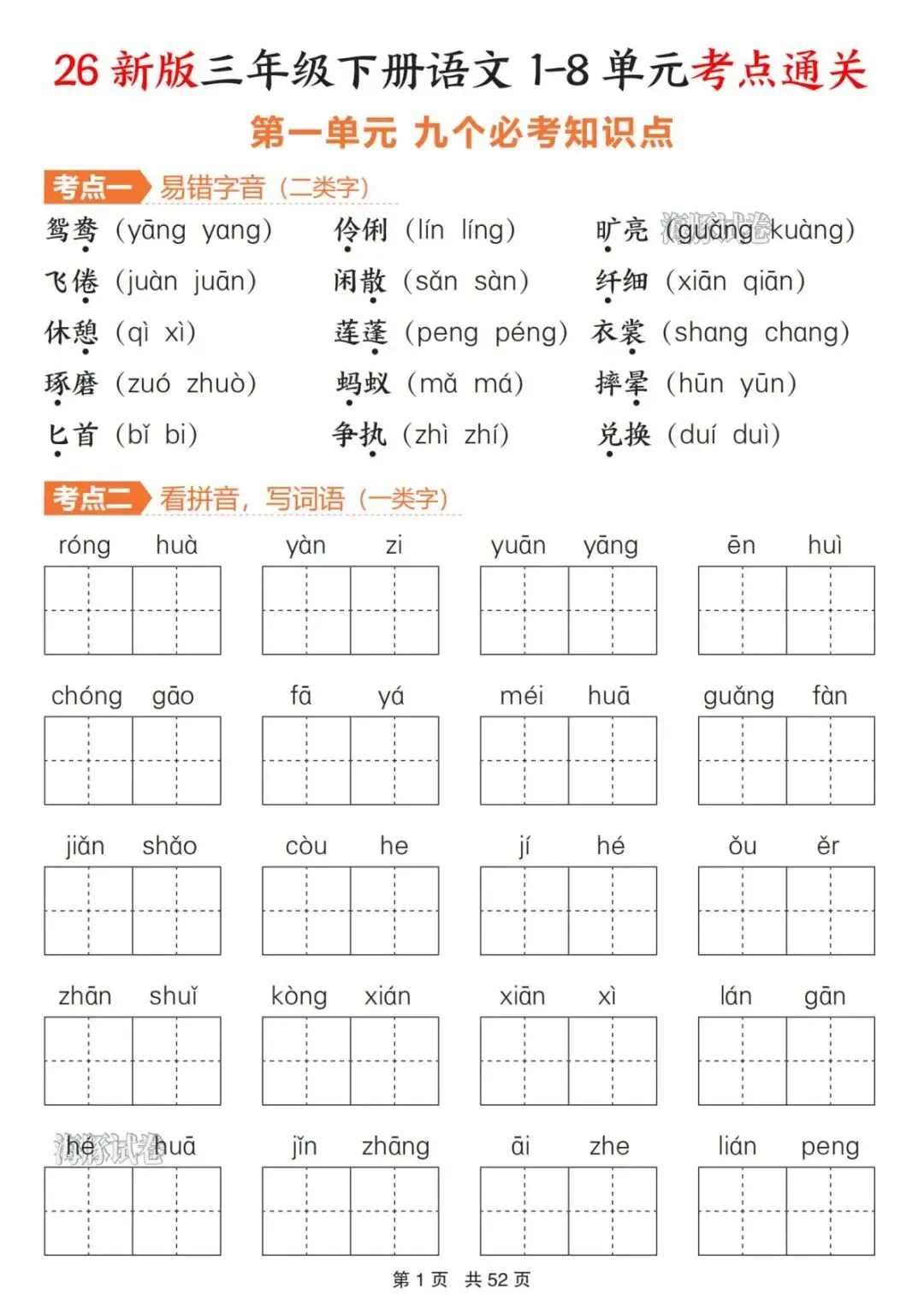 晨妈今日推荐26春三年级下册语文期中复习1-8单元考点通关练习,资料共52页,电子版可打印
