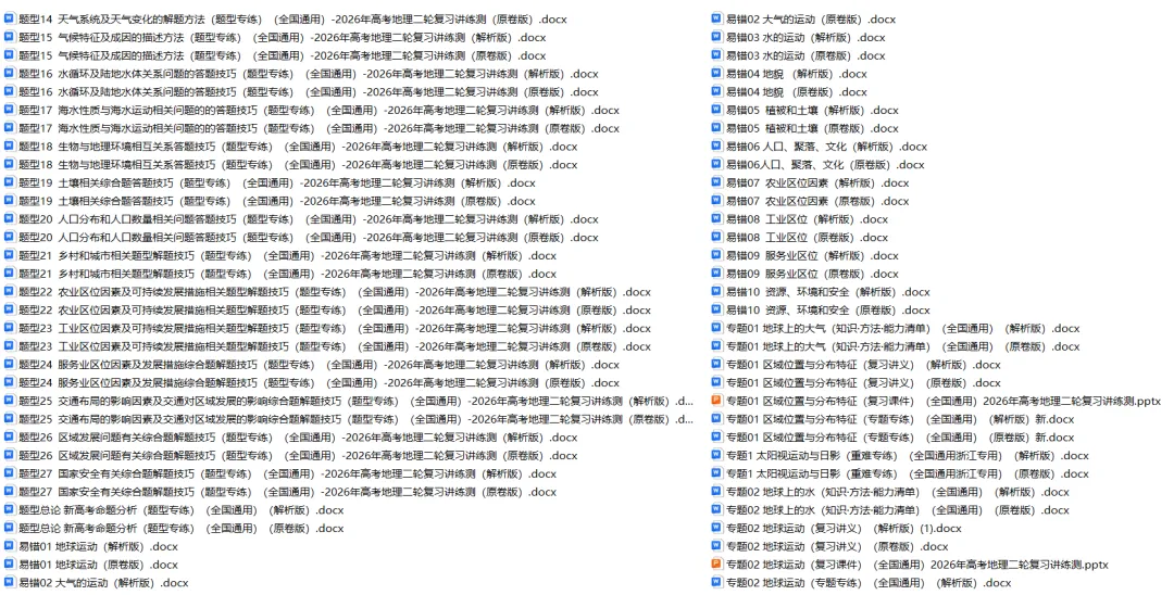 今天学长给同学们整理了高中地理——2026年高考二轮复习讲义+练习+题型专练(全国通用版)。家有高中生的家长可以给孩子下载打印一份。