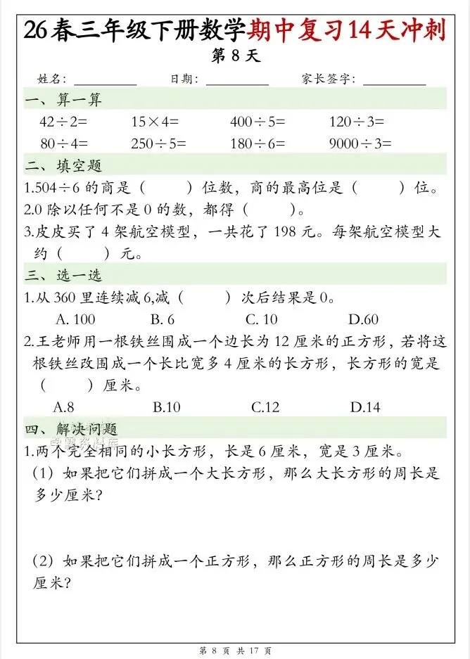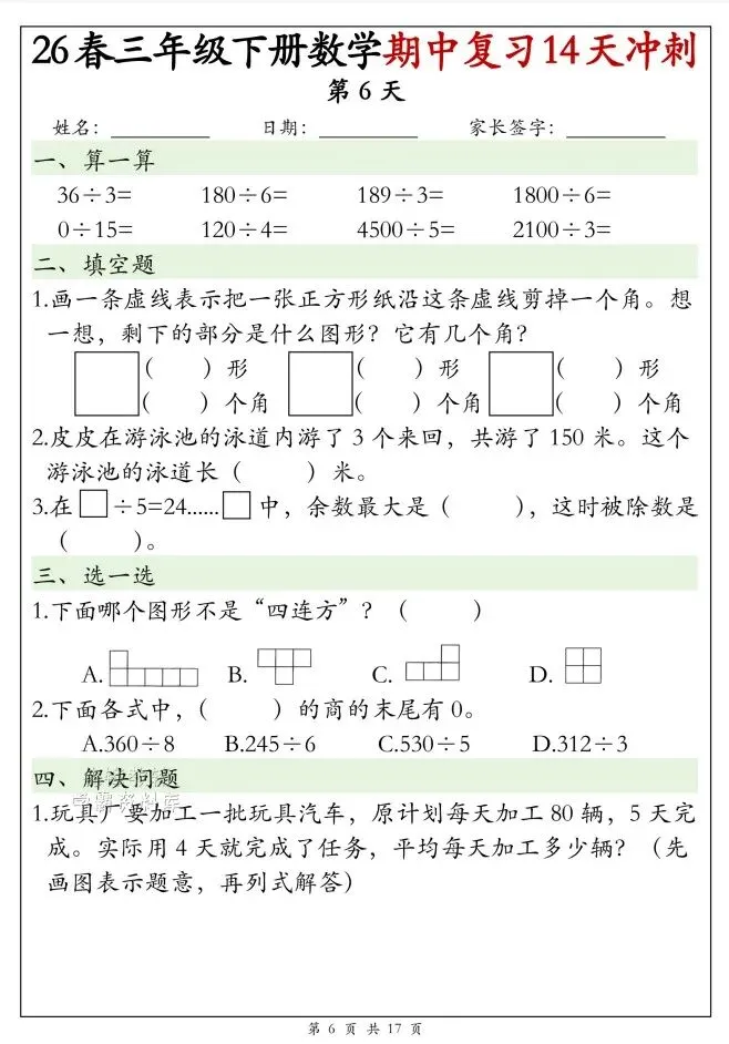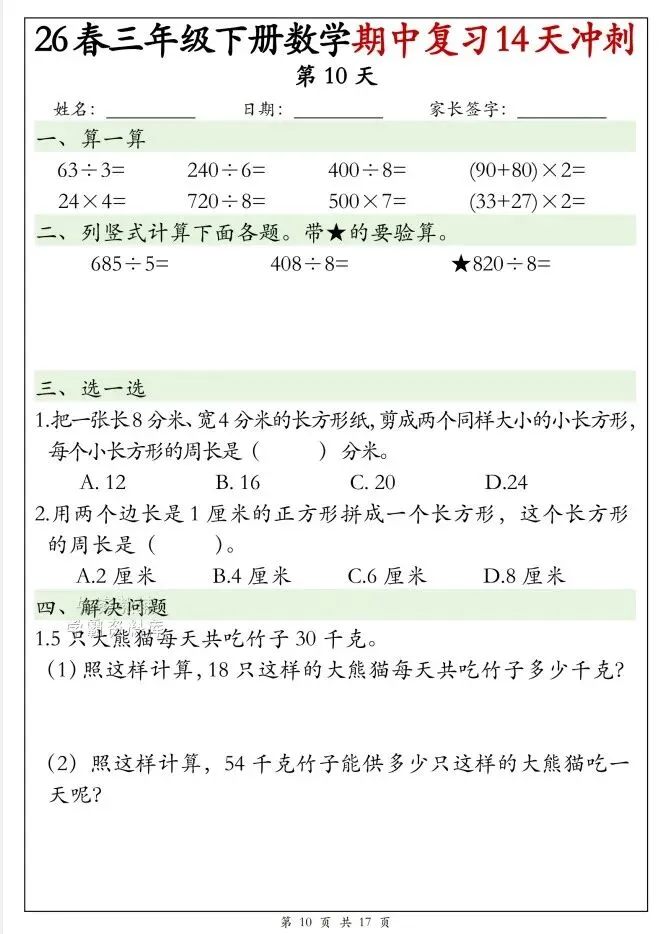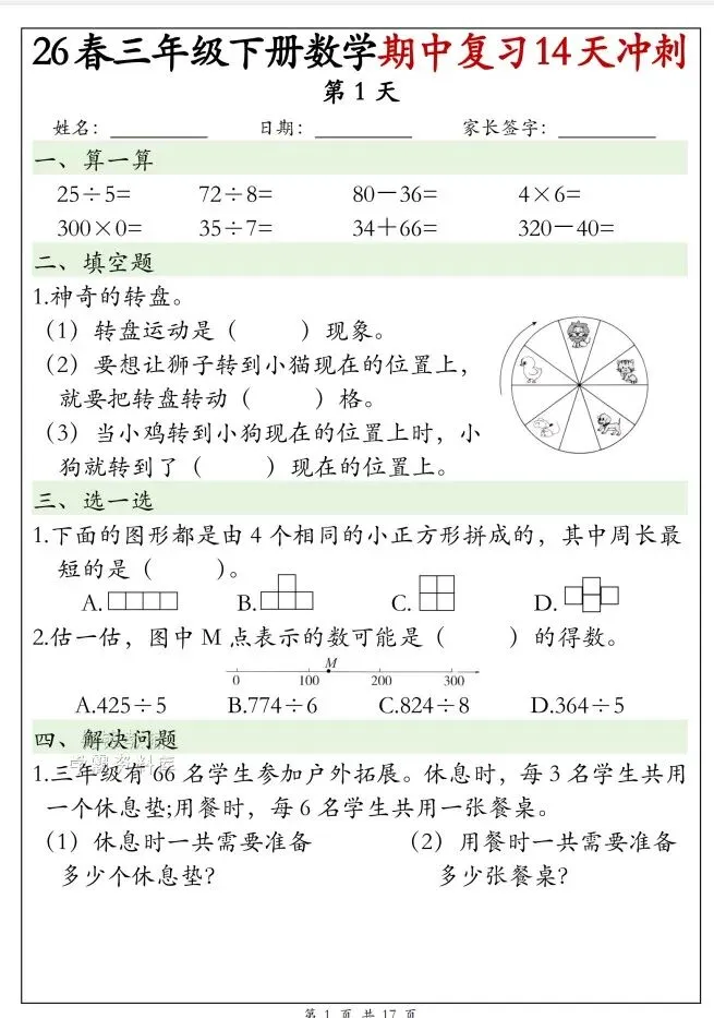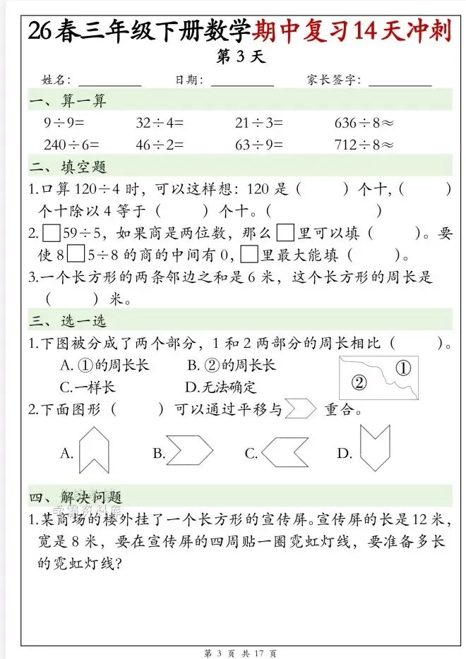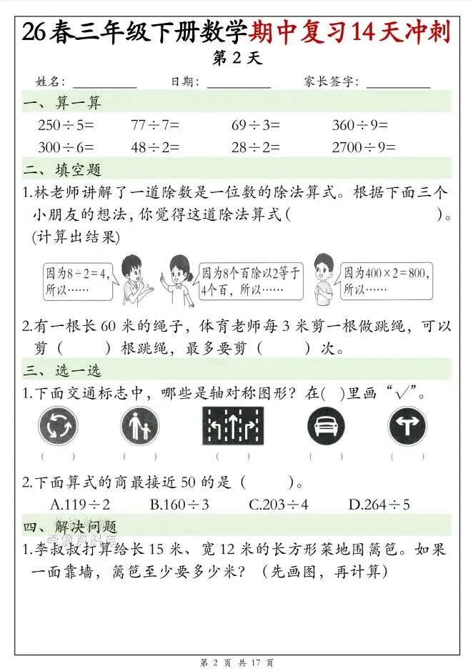 今天给大家整理了26春三年级下册数学期中复习14天冲刺(完整版),转发给朋友或班级群,受益更多人,帮助孩子学习!