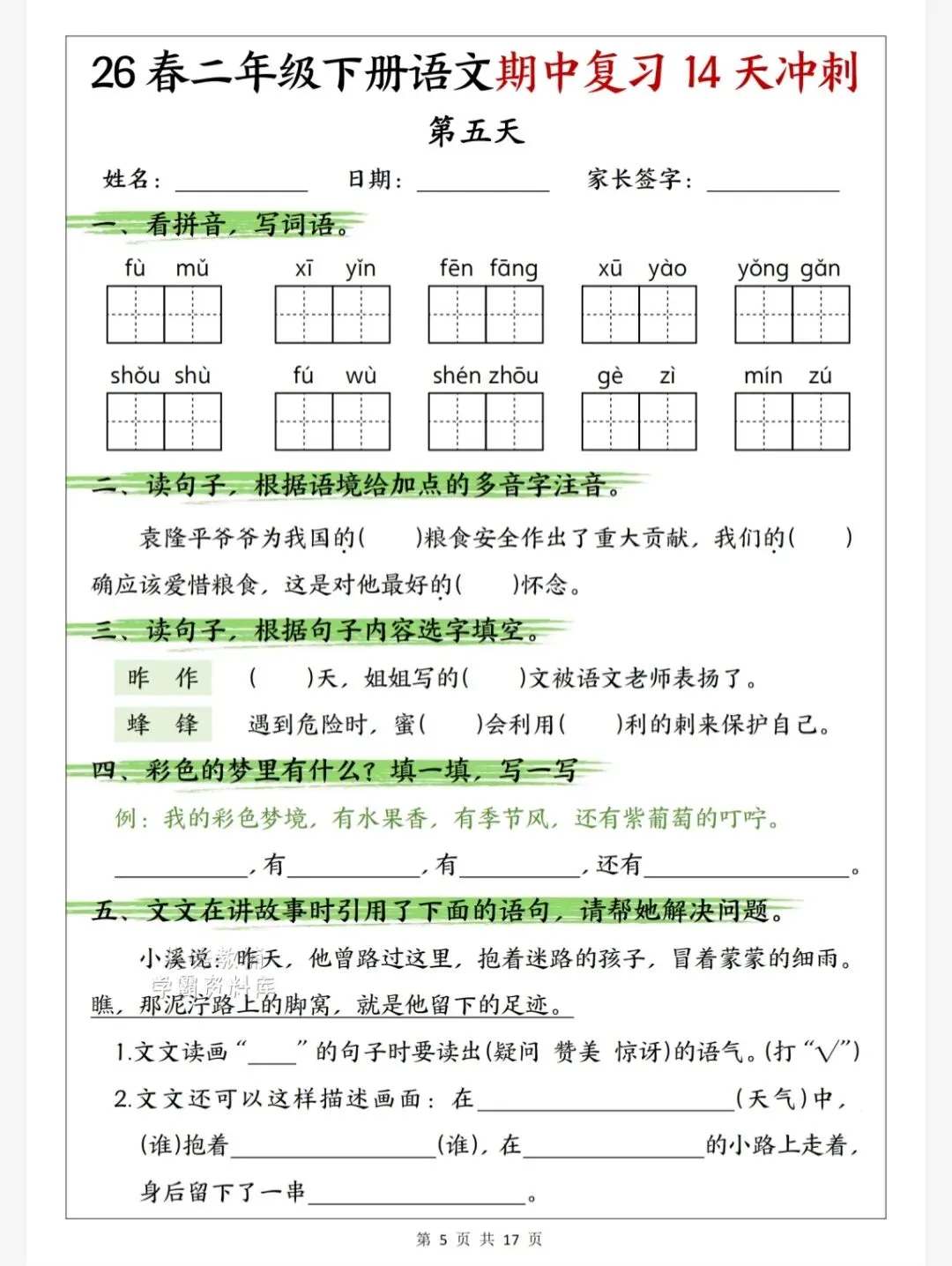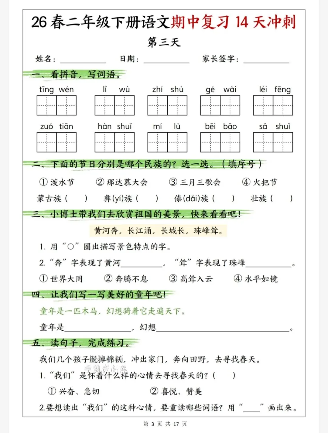 今天给大家整理了26春二年级下册语文期中复习14天冲刺,转发给朋友或班级群,受益更多人,帮助孩子学习!