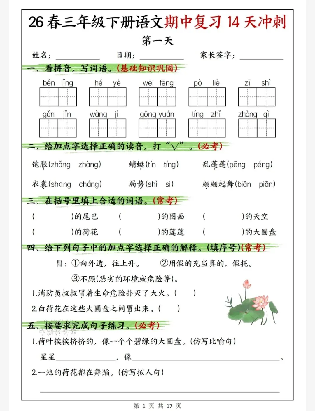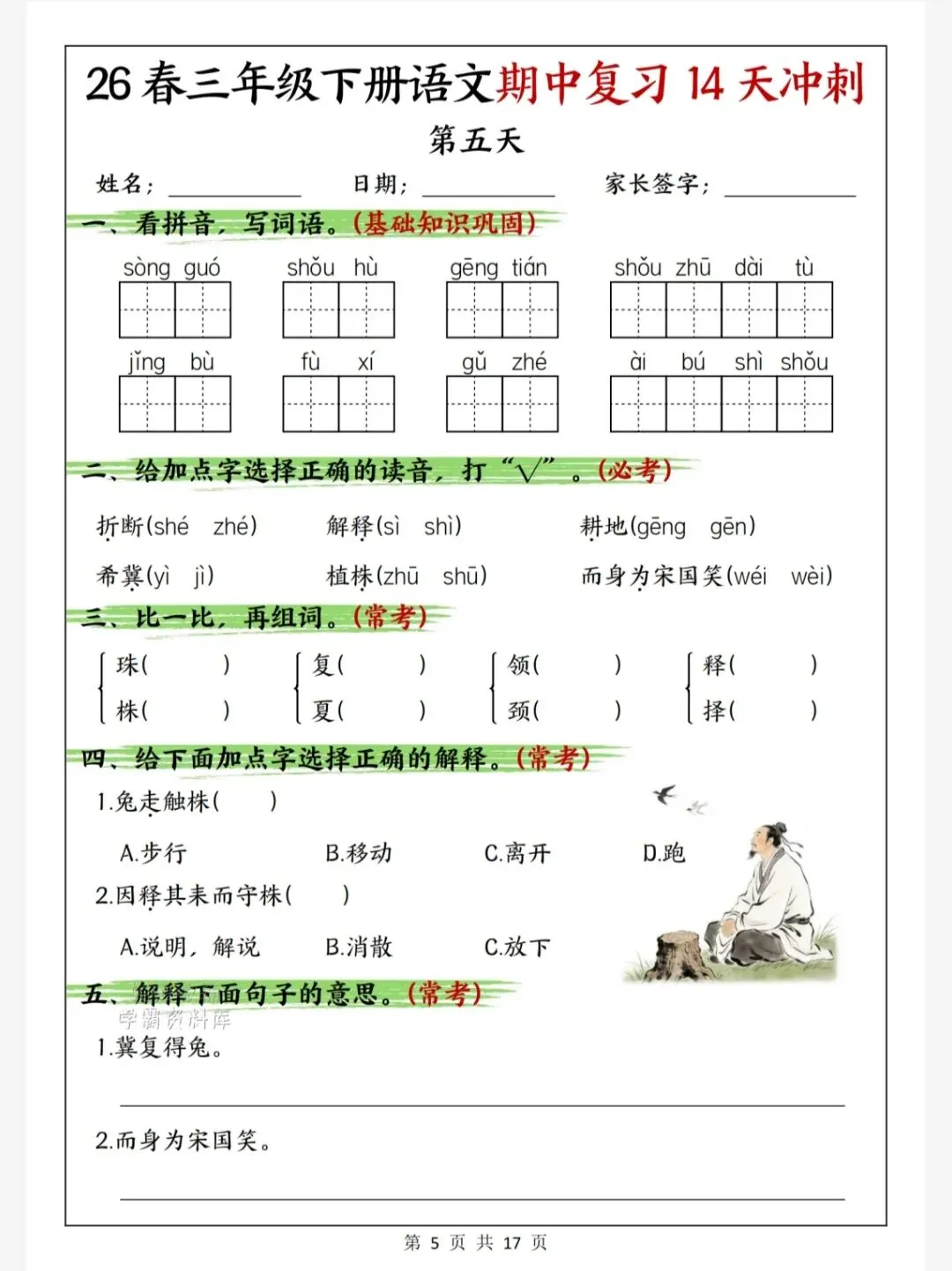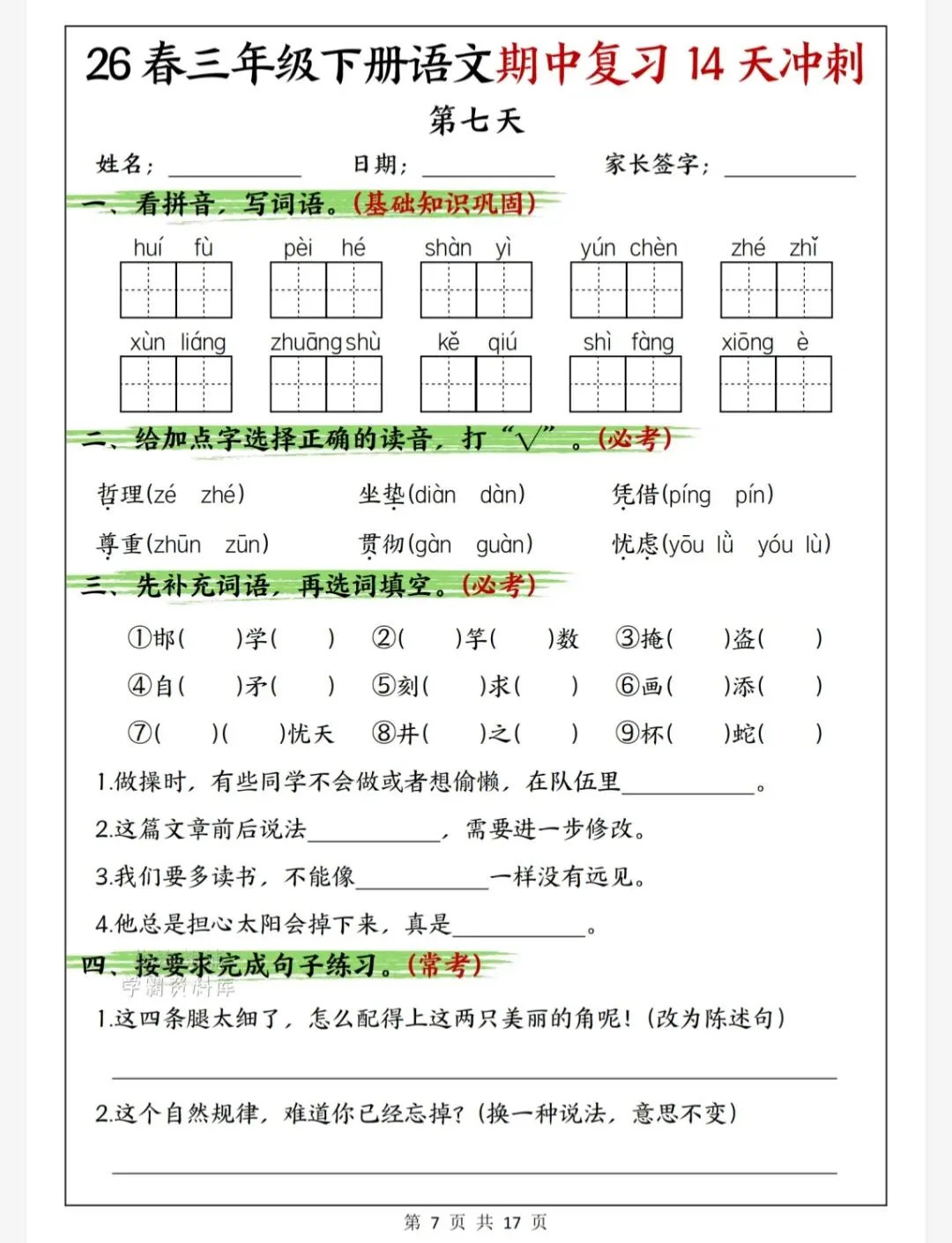 今天给大家整理了26春三年级下册语文期中复习14天冲刺,转发给朋友或班级群,受益更多人,帮助孩子学习!
