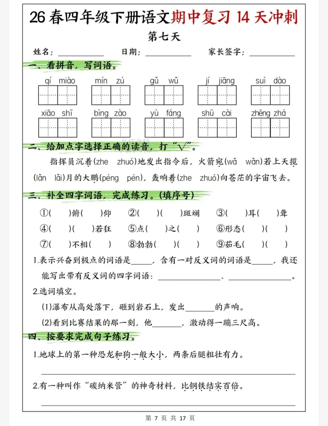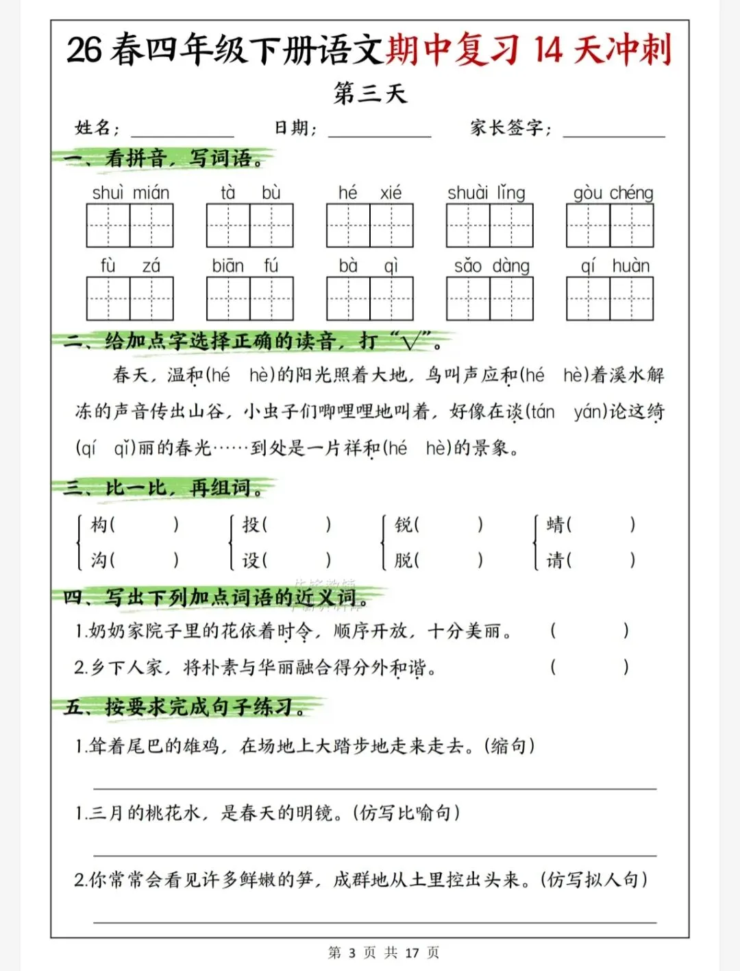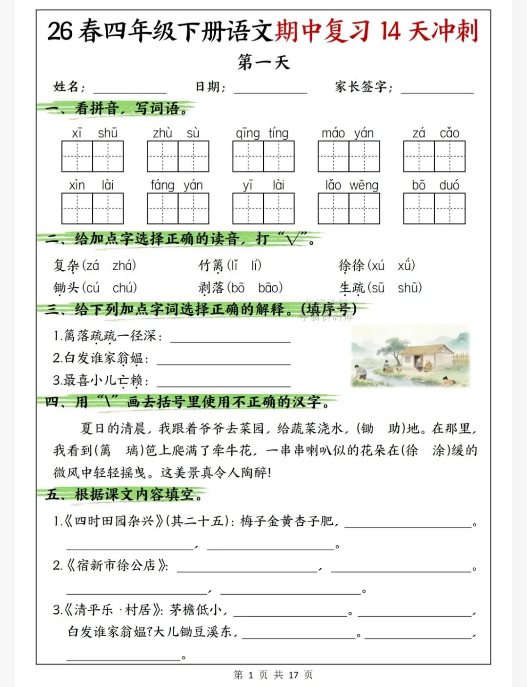 今天给大家整理了26春四年级下册语文期中复习14天冲刺,转发给朋友或班级群,受益更多人,帮助孩子学习!