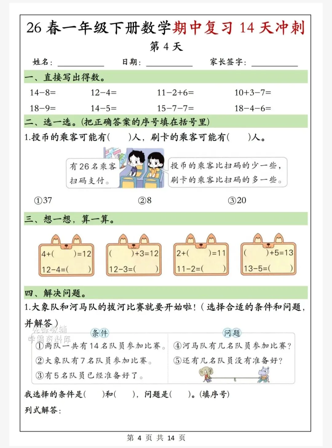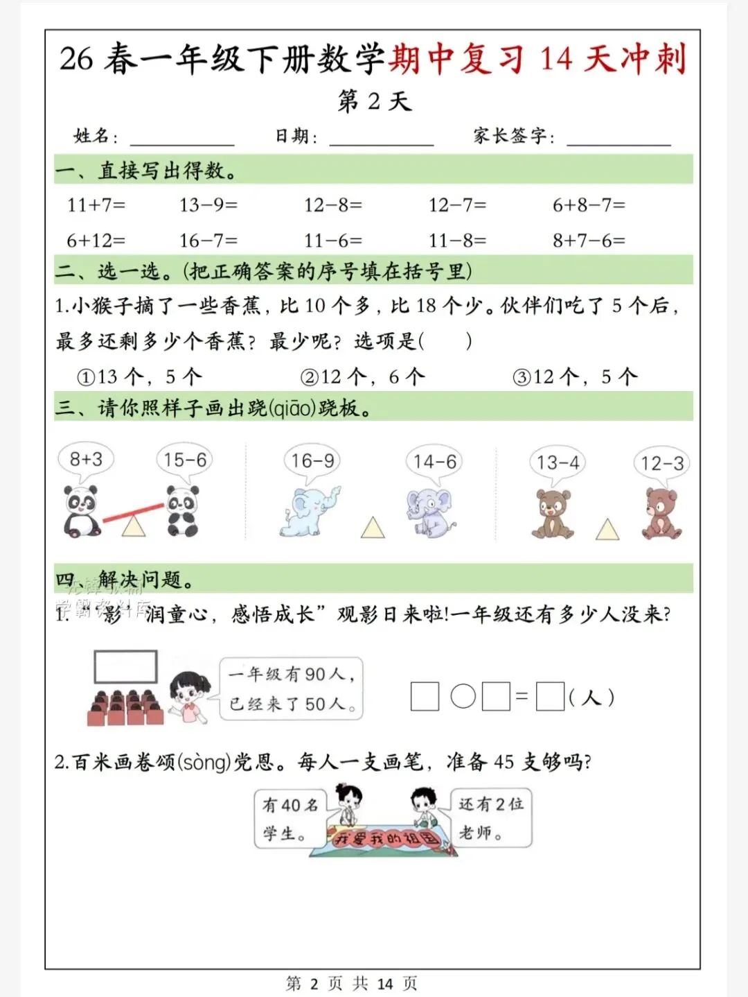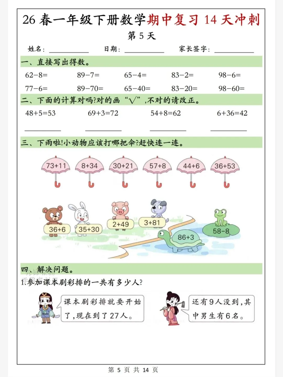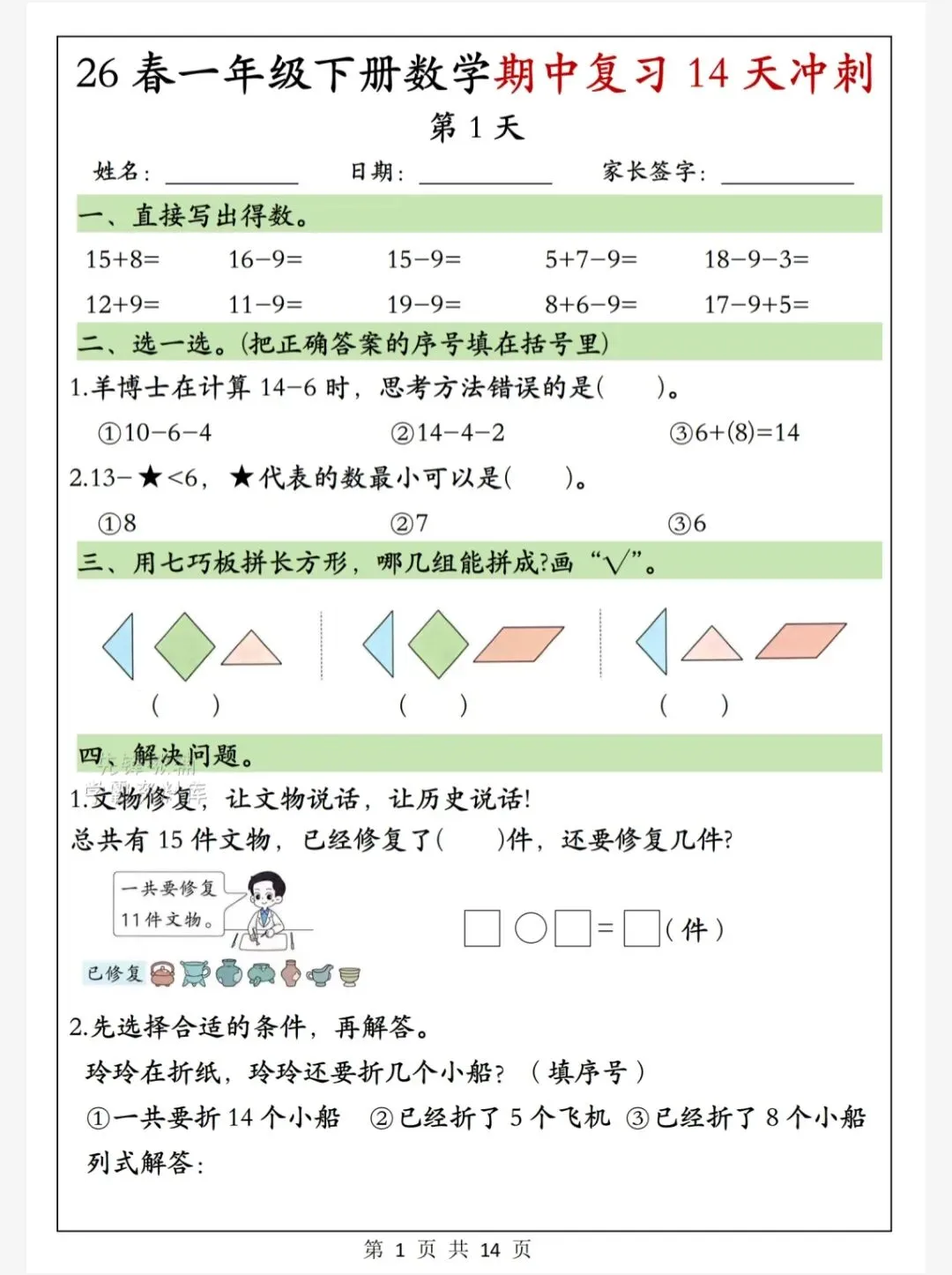 今天给大家整理了26春一年级下册数学期中复习14天冲刺,转发给朋友或班级群,受益更多人,帮助孩子学习!